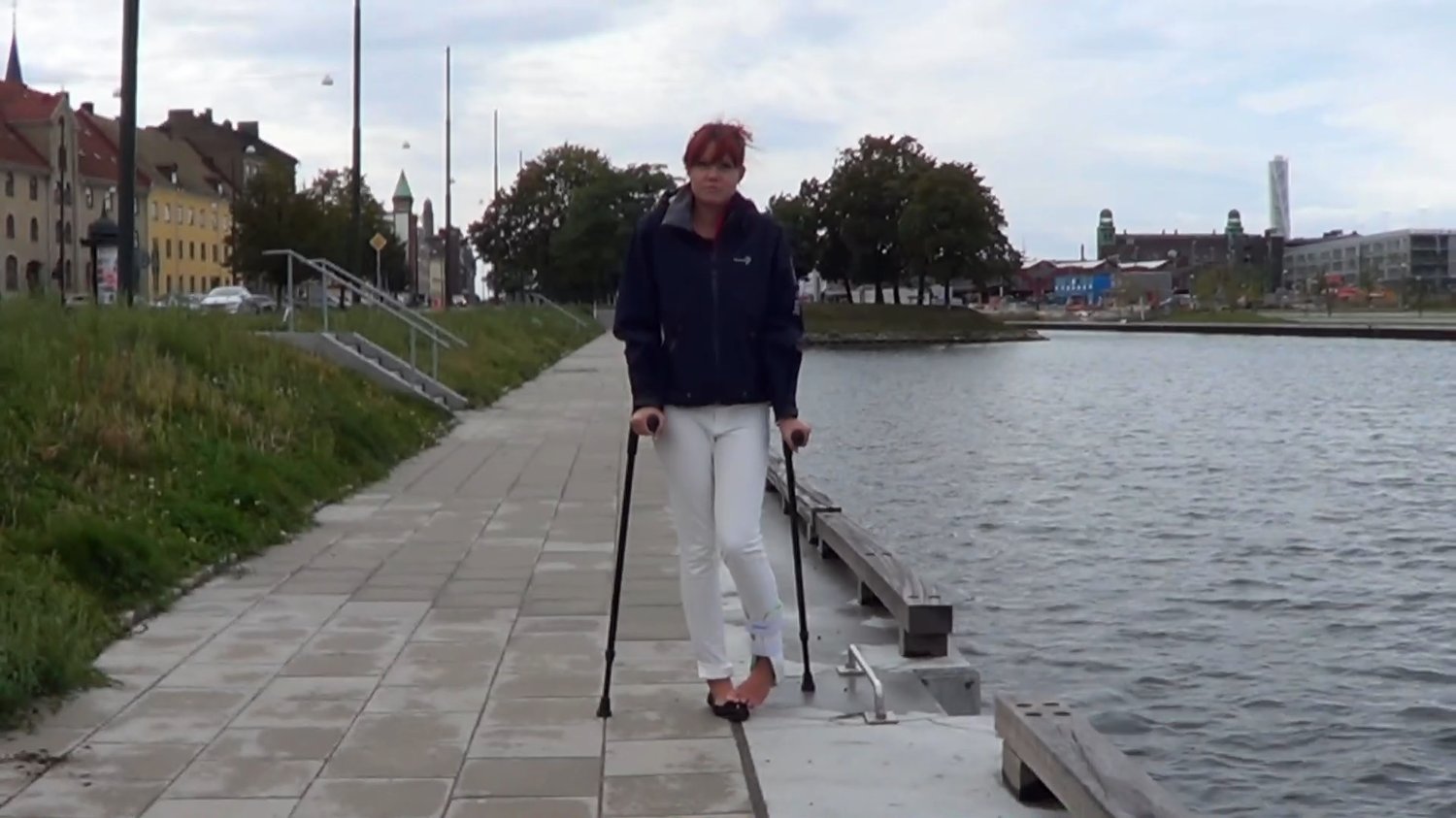 With a jacket, white pants, a black shoe on her right foot and a aircast on her hurt left ankle do we see Midnight crutch over the street and down to the water.She crutch down some steps to come closer closer to the water and we follow her a bit behind.