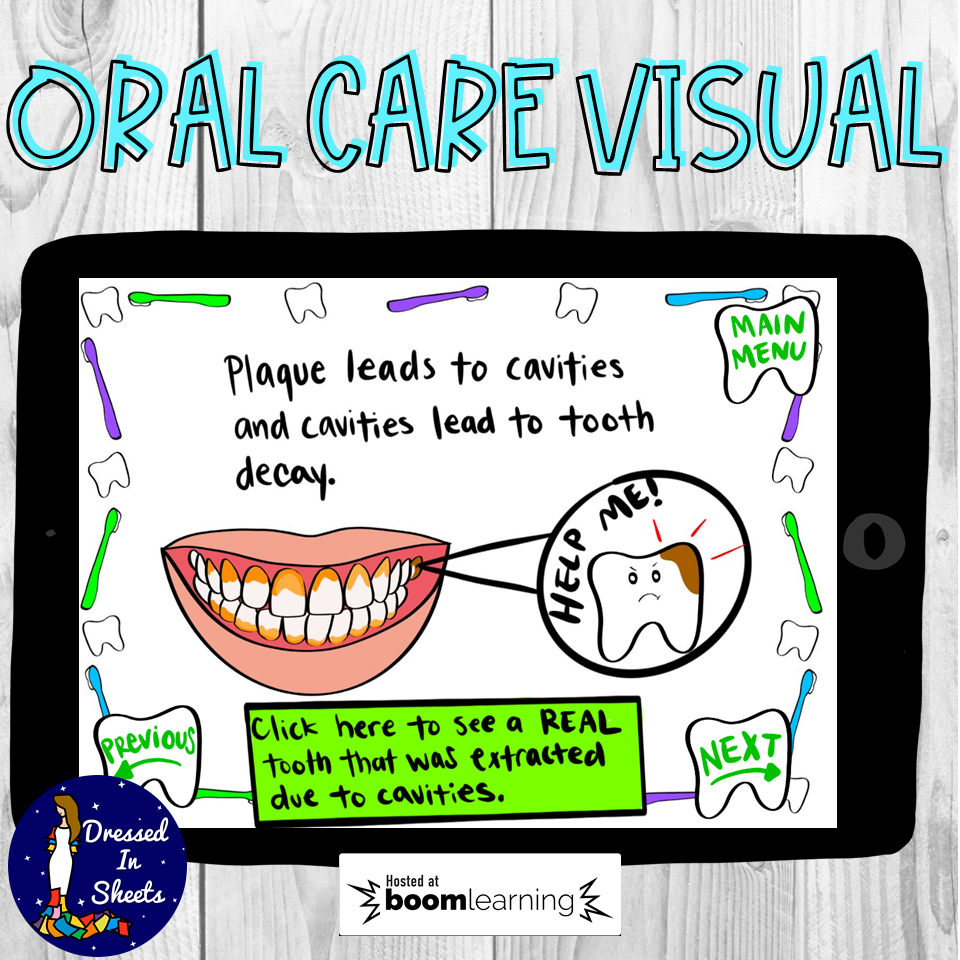 Allow kids to learn the importance of oral care with this interactive BOOM deck. It will show the children how to brush, avoid cavities, floss, and what happens when you get cavities. This BOOM deck has pictures of a real tooth that was extracted because of tooth decay. Viewing of the picture is optional and students can choose whether to see it. Showing pictures is good and informative and helps students understand why proper oral hygiene is important. A quiz is set at the end so they can review what they have learned.