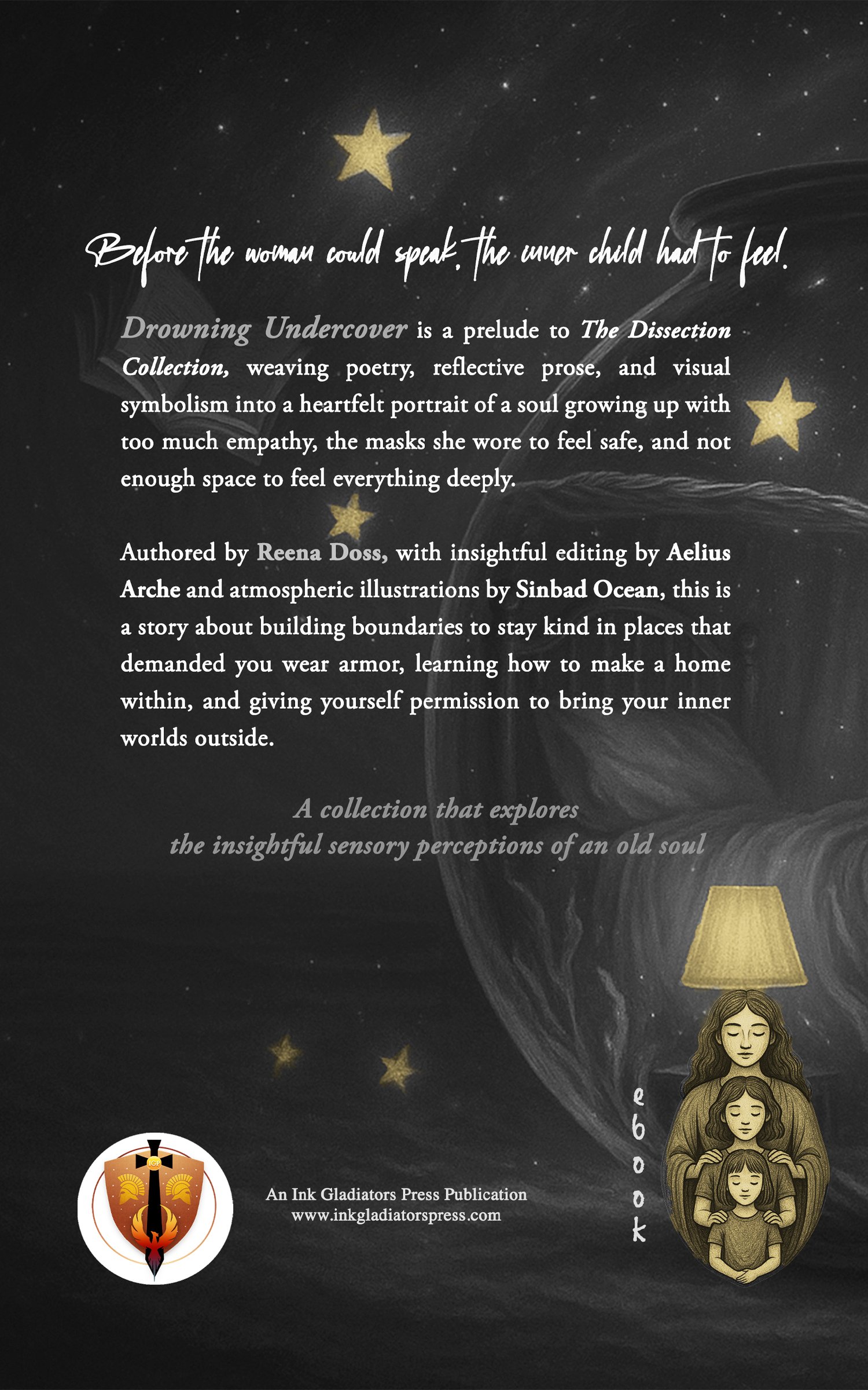 Drowning Undercover is a prelude to The Dissection Collection, weaving poetry, reflective prose, and visual symbolism into a heartfelt portrait of a soul growing up with too much empathy, the masks she wore to feel safe, and not enough space to feel everything deeply. Authored by Reena Doss, with insightful editing by Aelius Arche and atmospheric illustrations by Sinbad Ocean, this is a story about building boundaries to stay kind in places that demanded you wear armor, learning how to make a home within, and giving yourself permission to bring your inner worlds outside.