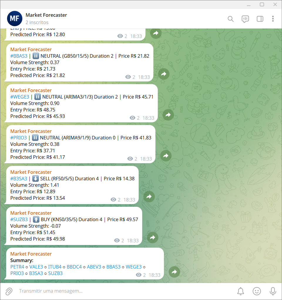 Telegram open channel with daily signals run via GitHub Actions, which anyone can sign up to get a feel for what this bot can offer: