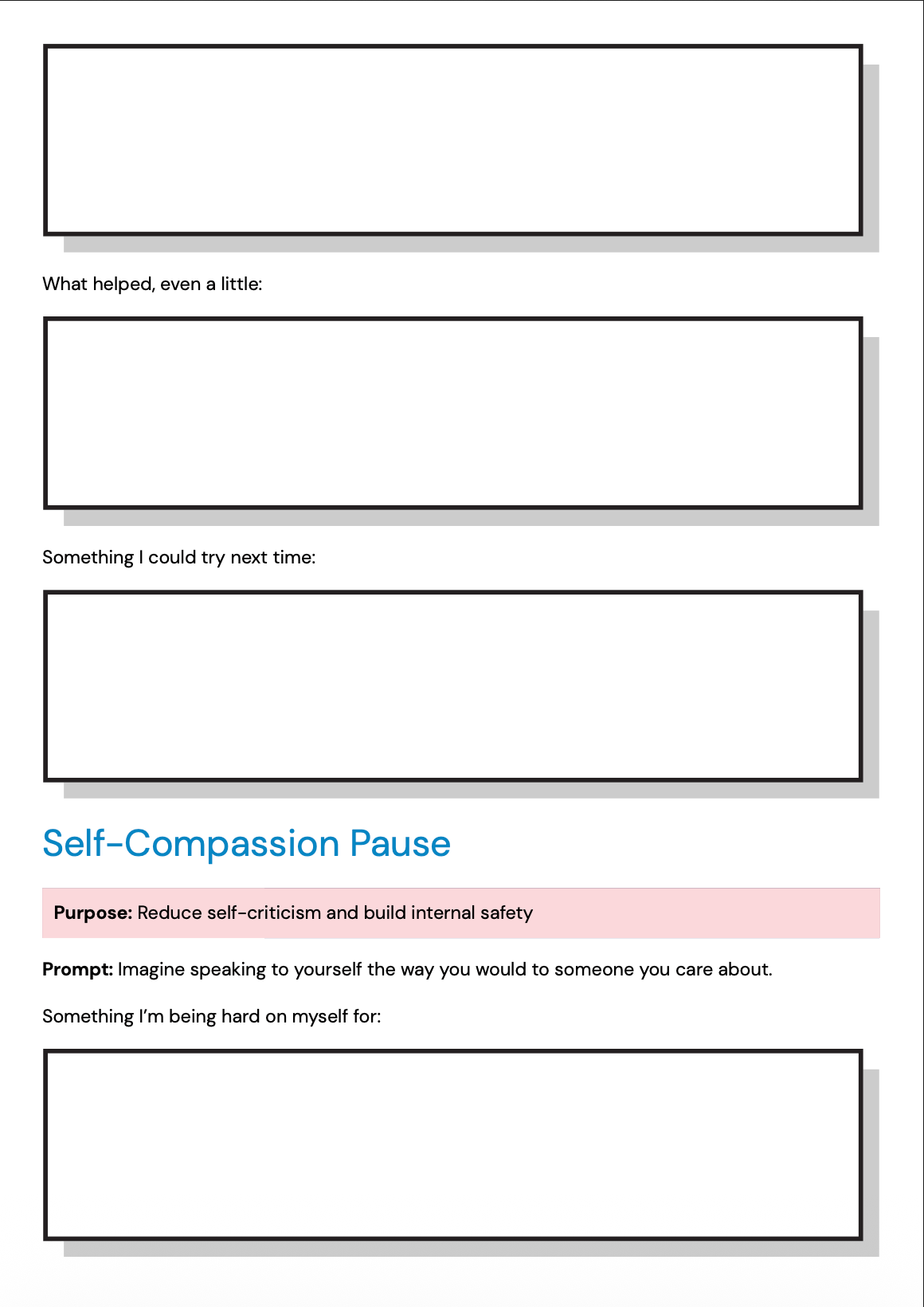 Clients are encouraged to engage at their own pace, skip prompts as needed, and focus on curiosity rather than “right” answers.