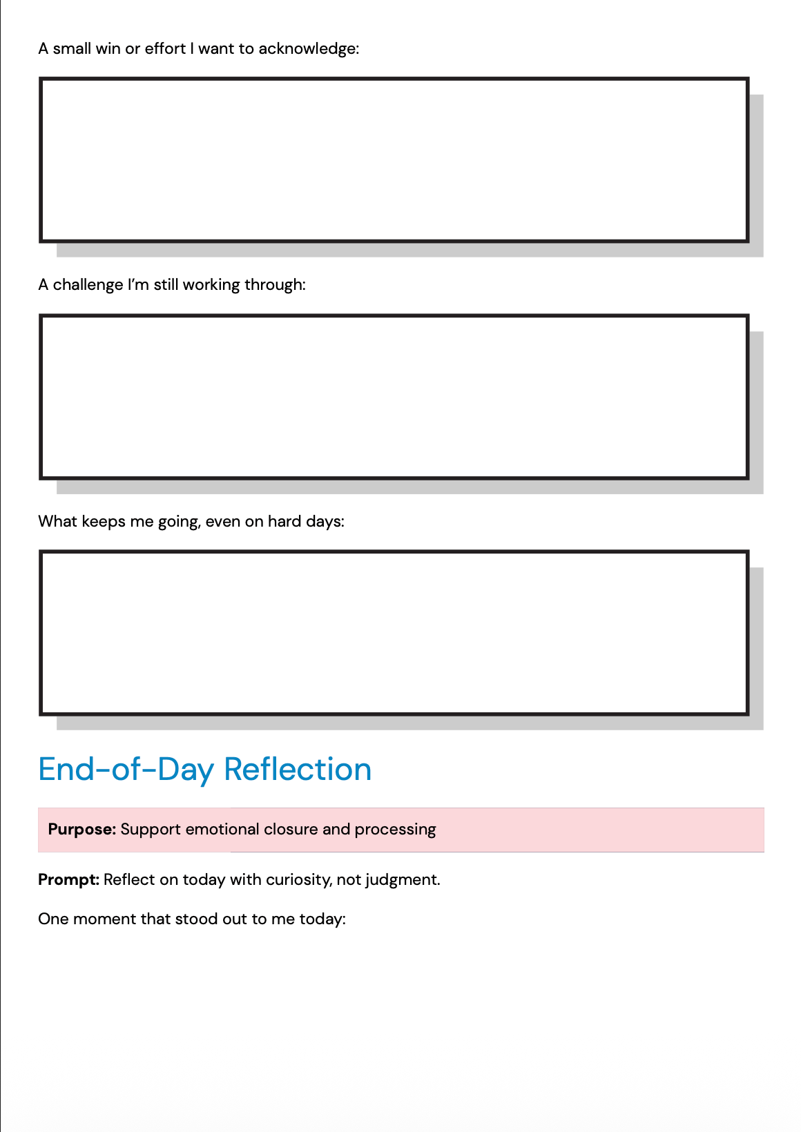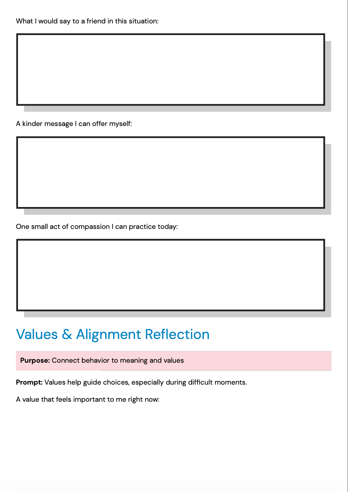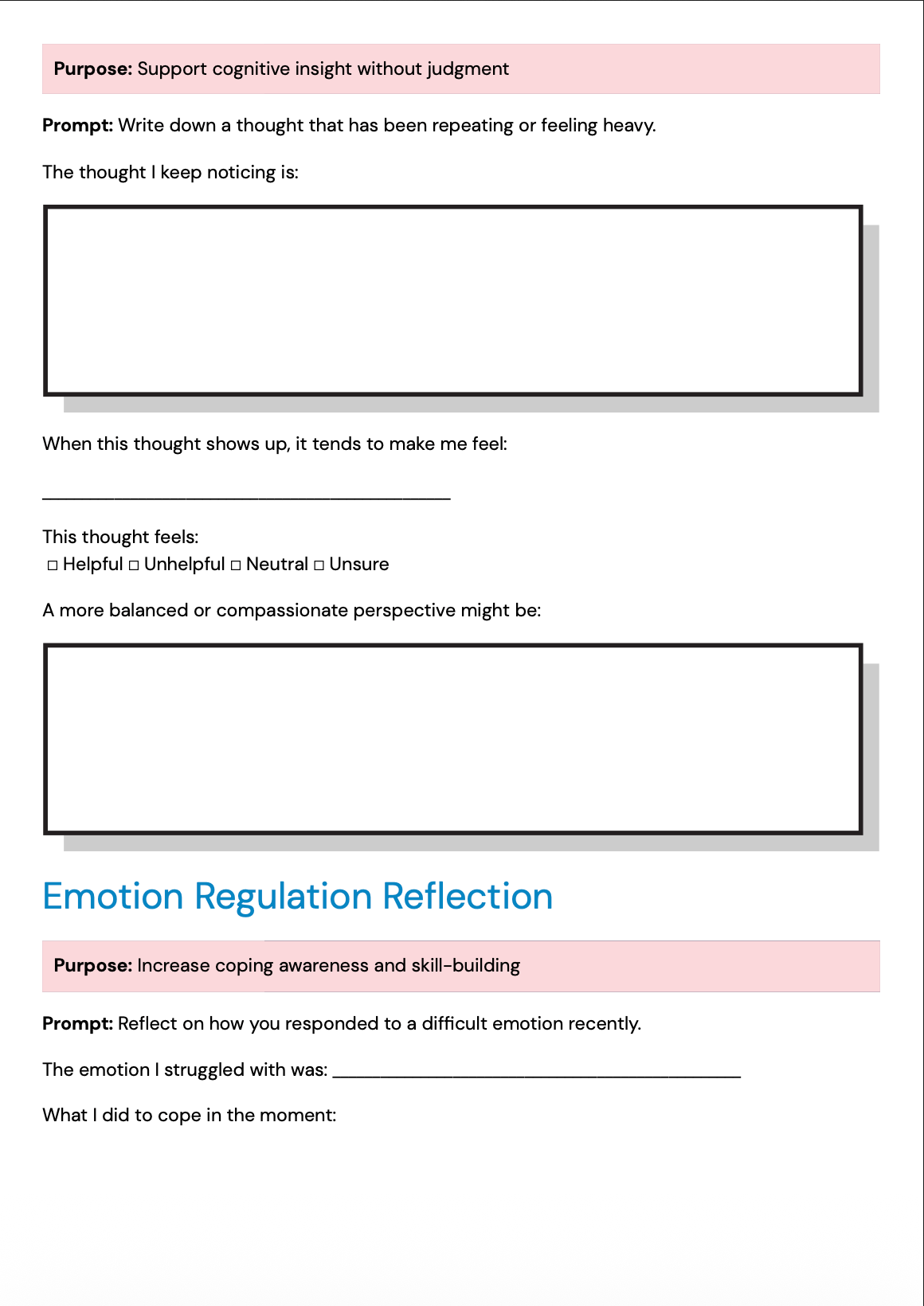 These Reflection Journaling Pages are designed to support adult clients in developing self-awareness, emotional insight, and self-compassion. Created by a Licensed Mental Health Counselor (LMHC), this digital resource provides clinicians with session-ready journaling prompts that can be used flexibly across treatment settings.