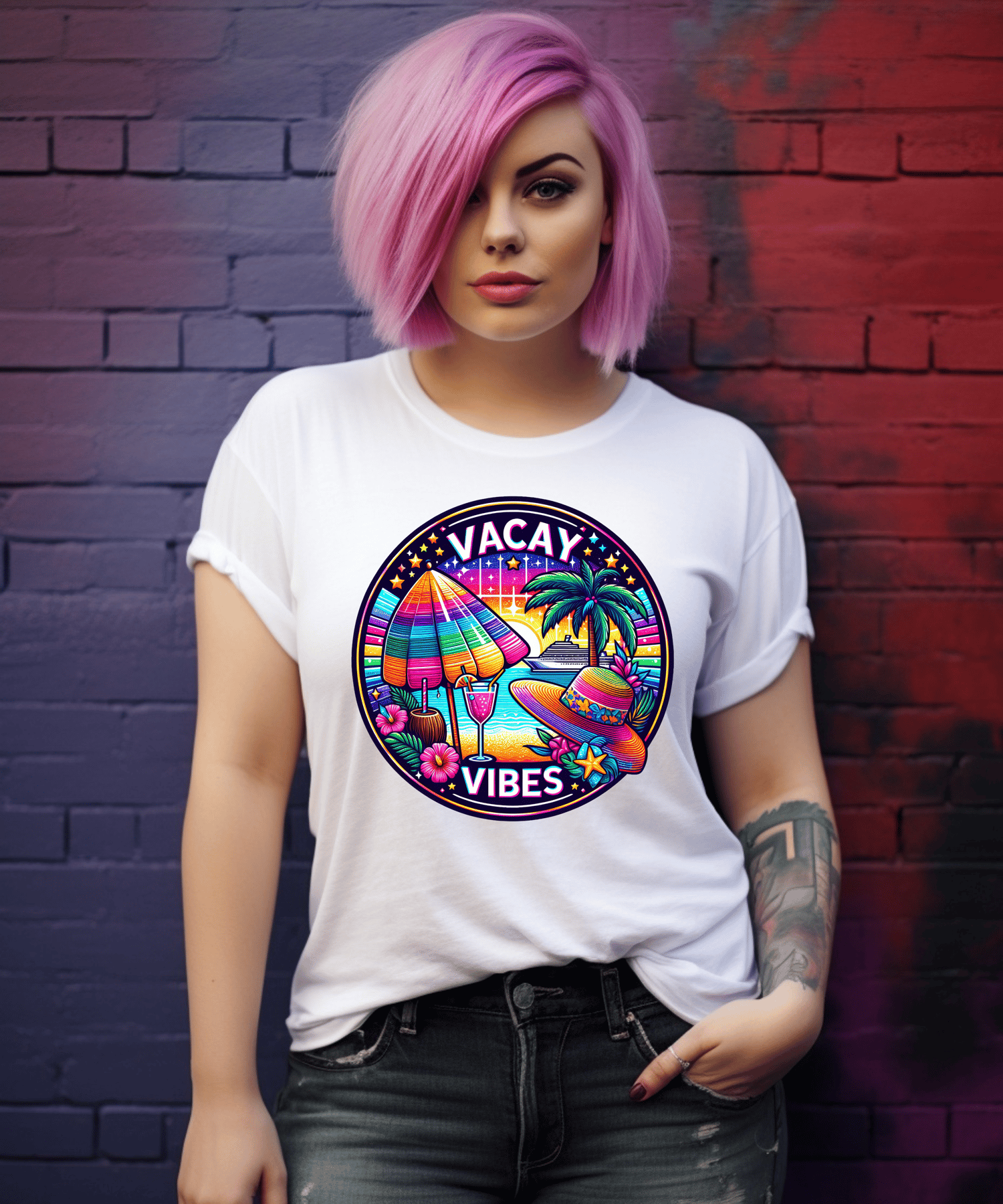 Bring the heat, the color, and the vibes with this bold and tropical “Vacay Vibes” design! Featuring a vibrant rainbow umbrella, cruise ship, cocktail, and summer hat against a sunset backdrop—this design screams relaxation and fun in the sun. Perfect for cruise shirts, vacay tumblers, summer totes, and more.