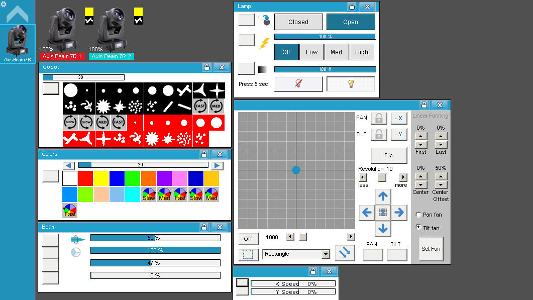 • 17 Gobos (propios del equipo dibujados) + Open + otros 17 de Shake + Rotación de la rueda de Gobos.