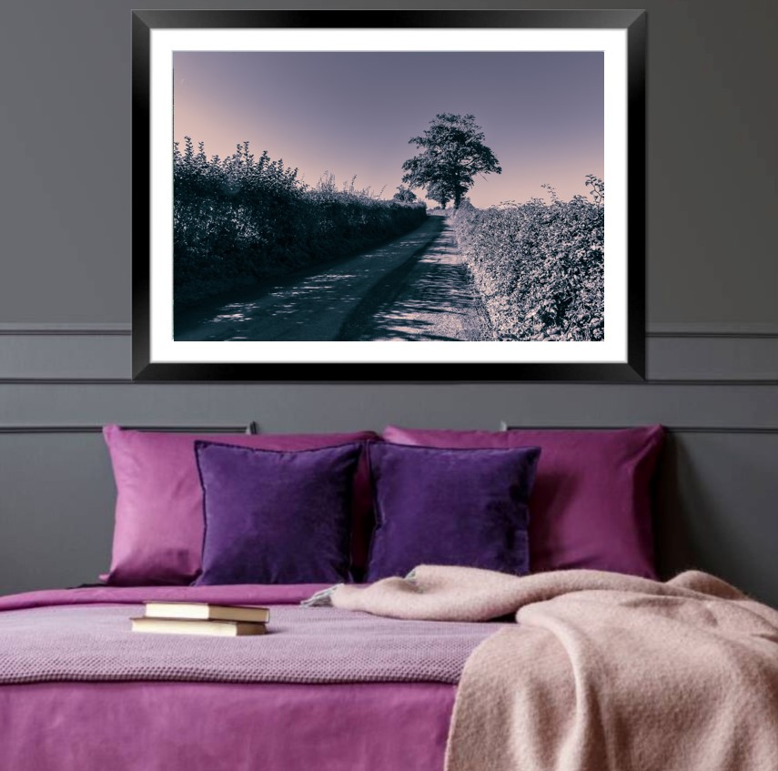 Here’s a typical Devon country lane, across the valley from Bradninch. I like the shadows cast on the road, leading to this grand tree. I added a unique purple and gold sepia effect.