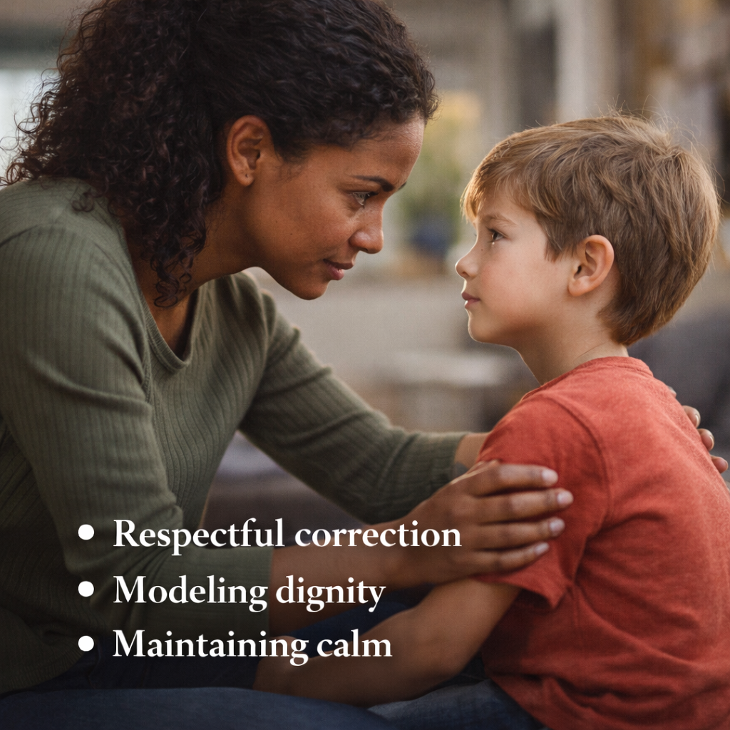 This guide focuses on respectful correction, calm tone, and modeling dignity — especially under stress.