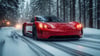 Candy Apple Red Sports Car Traveling on a Snowy Road, Winter Drive Stock Photo