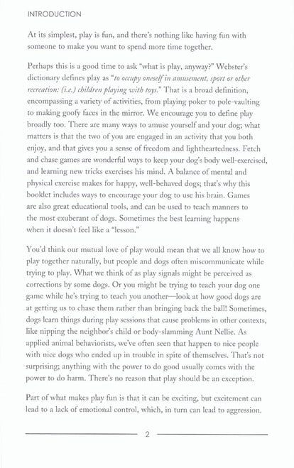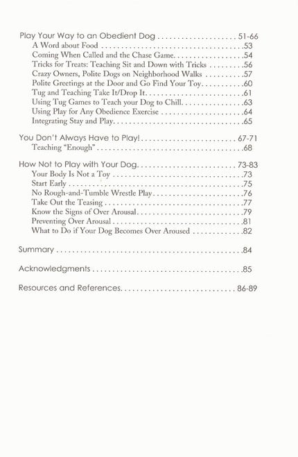 Play is fun, but don't be fooled into thinking it's just goofy or frivolous. Play is powerful stuff, and it has a profound influence on your relationship with your dog. This engagingly written booklet shows how play can enhance your relationship with your dog, improve your dog's responsiveness, and provide your dog with the mental and physical exercise he or she needs. Inside is up-to-date research on how to tell your dog you want to play (most of us aren't very good at it!), some charming tricks and games to wow your friends, and an important section on how not to play with your dog. If you'd like a happier, more responsive dog and a closer relationship with each other, then this booklet is for you.