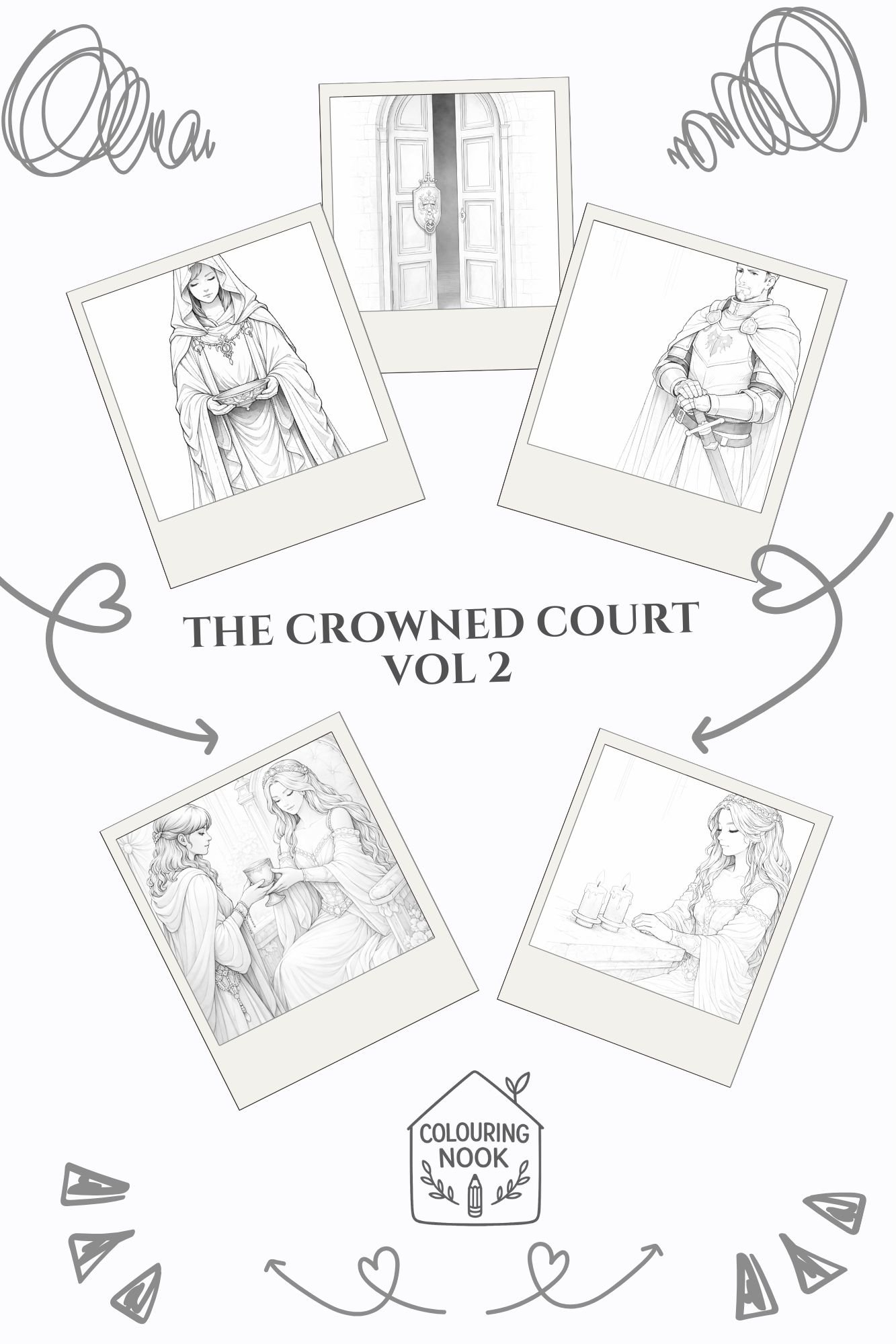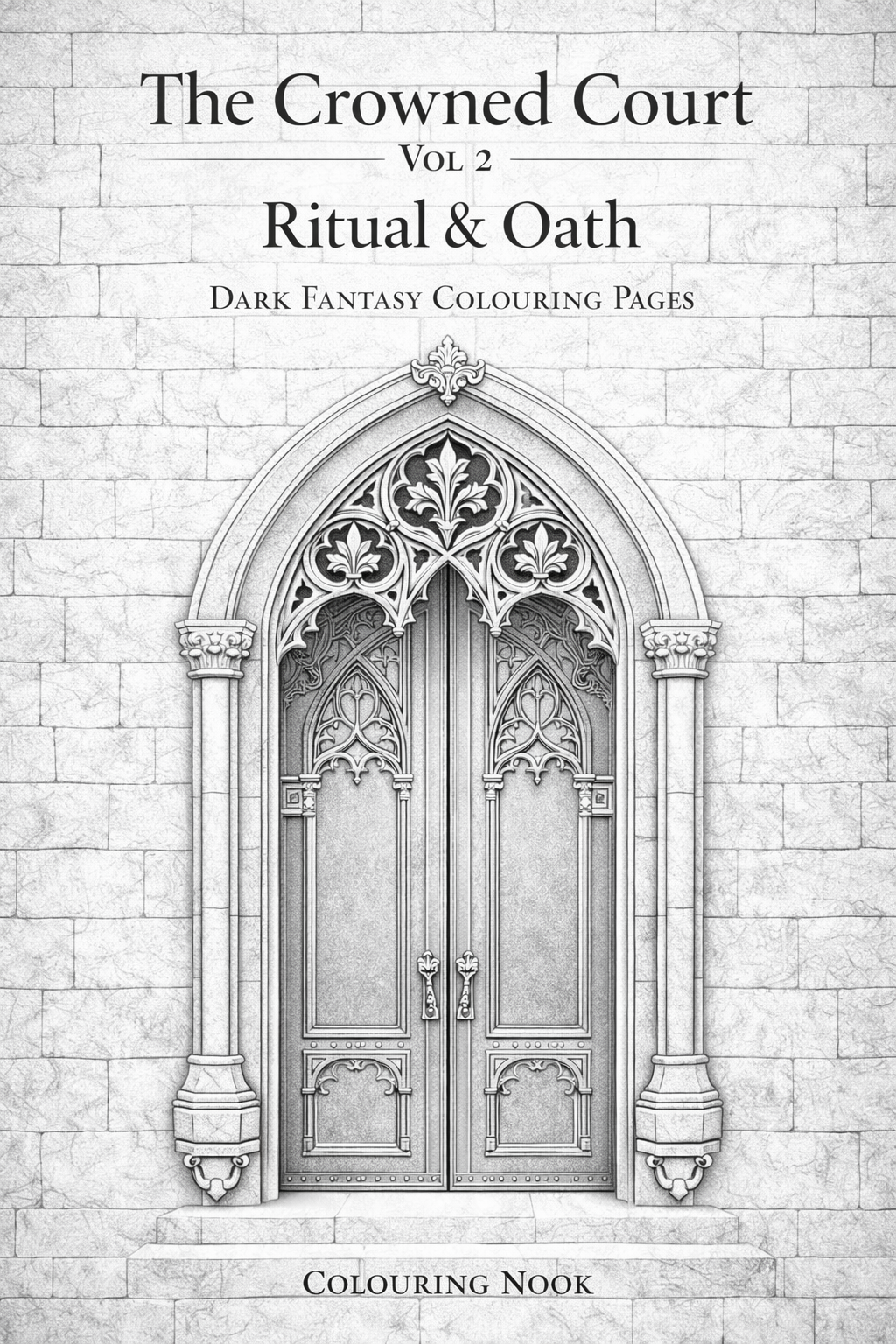 This dark fantasy colouring collection explores ritual, devotion, and oath-bound moments through elegant, gothic-inspired illustrations. Featuring ceremonial figures, candlelit scenes, armoured guardians, and arched doors that mark moments of change, each page is designed for slow, immersive colouring.