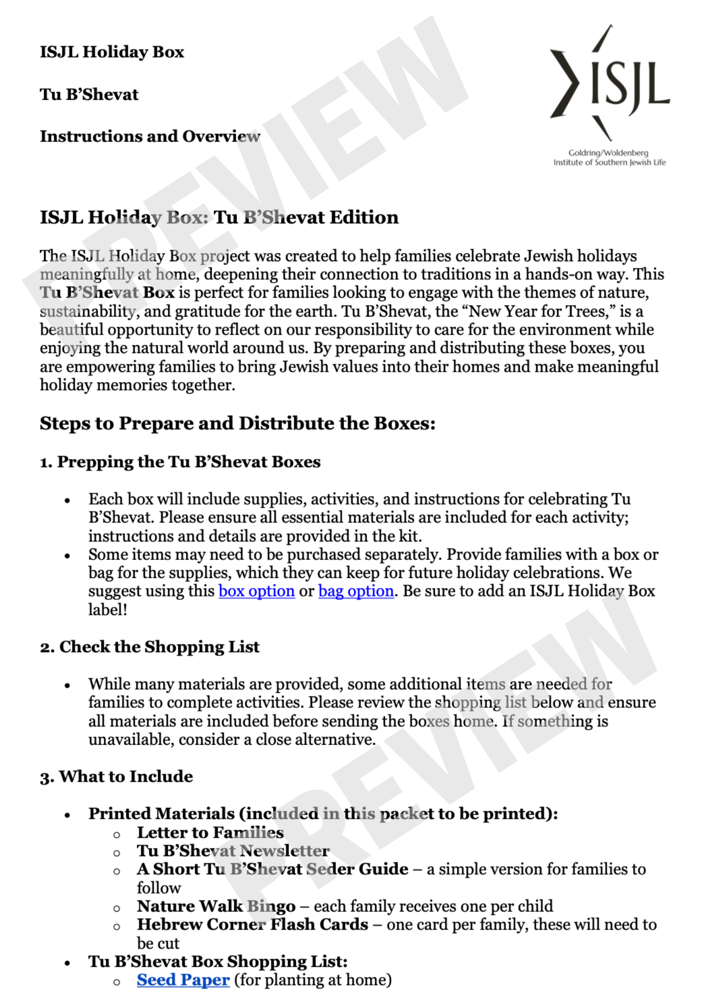 This is our full kit for the ISJL Holidays at Home - Tu Bish'vat. It includes all of the printed material, including the Tu Bish'vat family newsletters, shopping lists for the boxes, a family Tu Bish'vat seder and more! Use this kit to help engage families with Judaism at home and connect with one another. The ISJL will be releasing holiday boxes throughout the year and the guides are completely FREE! Enjoy!