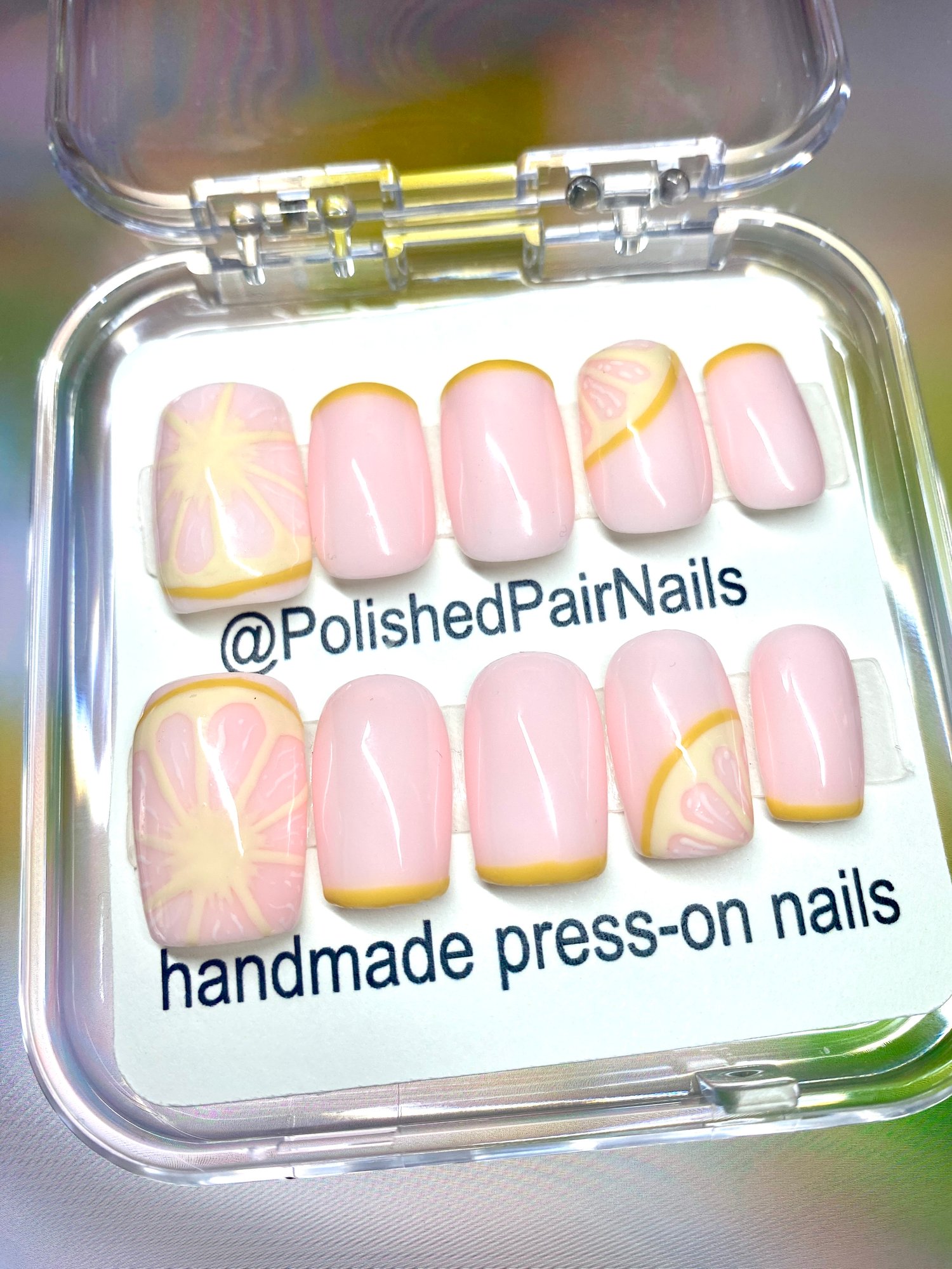 Feeling bright and bubbly? ☀️ These charming lemon slice press-on nails are the perfect way to add a pop of fresh style to any look! Made with durable and reusable Gel-X, they're designed to last. Dreaming of a different fruity design or a whole fruit salad on your nails? We happily accept customizations to match your unique taste!
