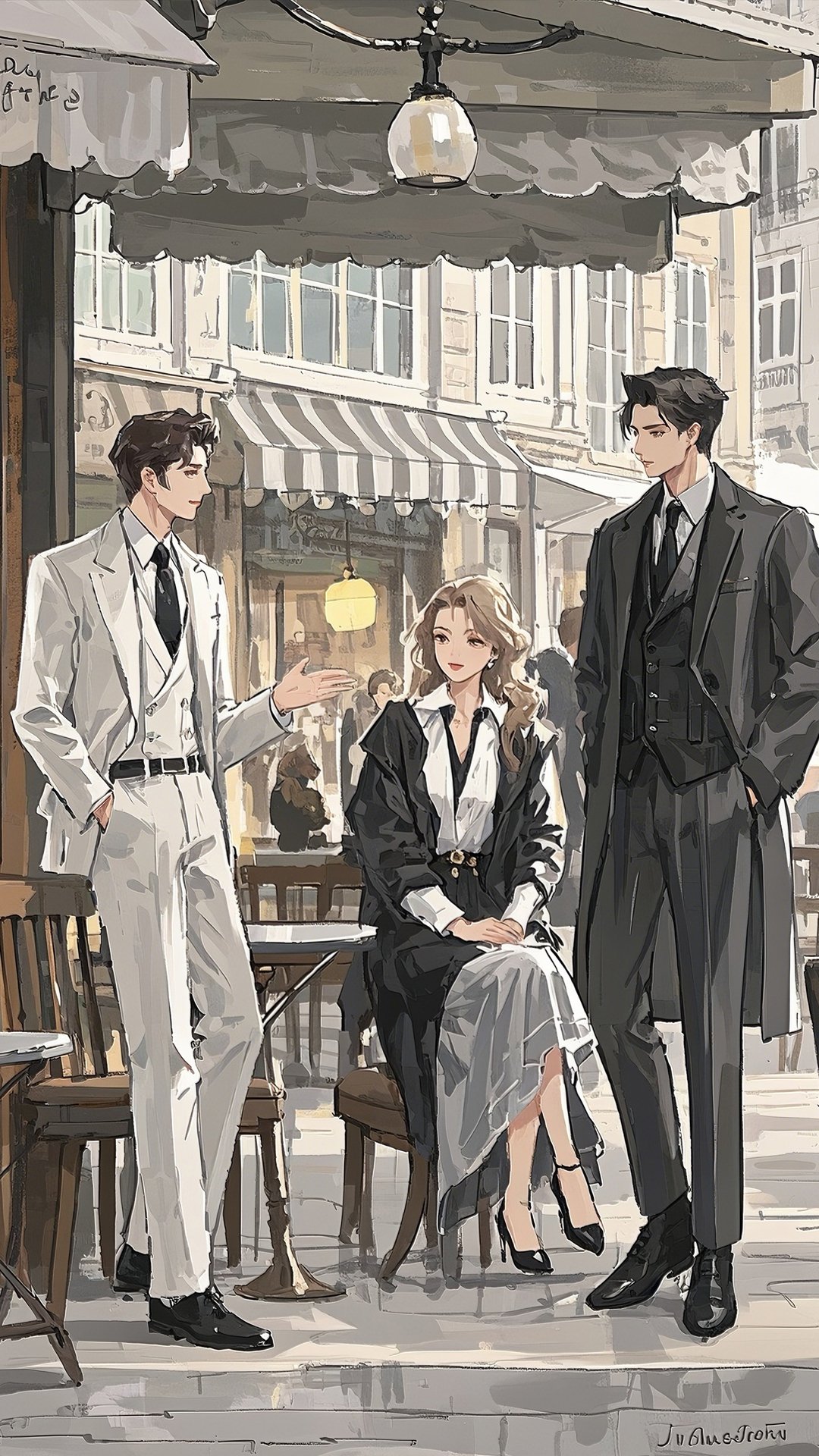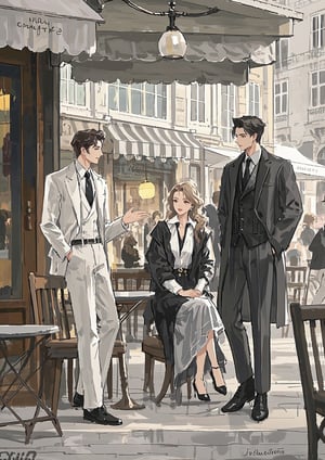 This artwork captures a refined and urban café scene with a stylish and cinematic atmosphere. The poses and expressions of the three characters feel natural, conveying a subtle sense of conversation and connection between them. The color palette is primarily composed of muted grey tones, with a striking contrast between black and white, enhancing the elegance of their monochrome outfits.