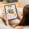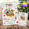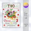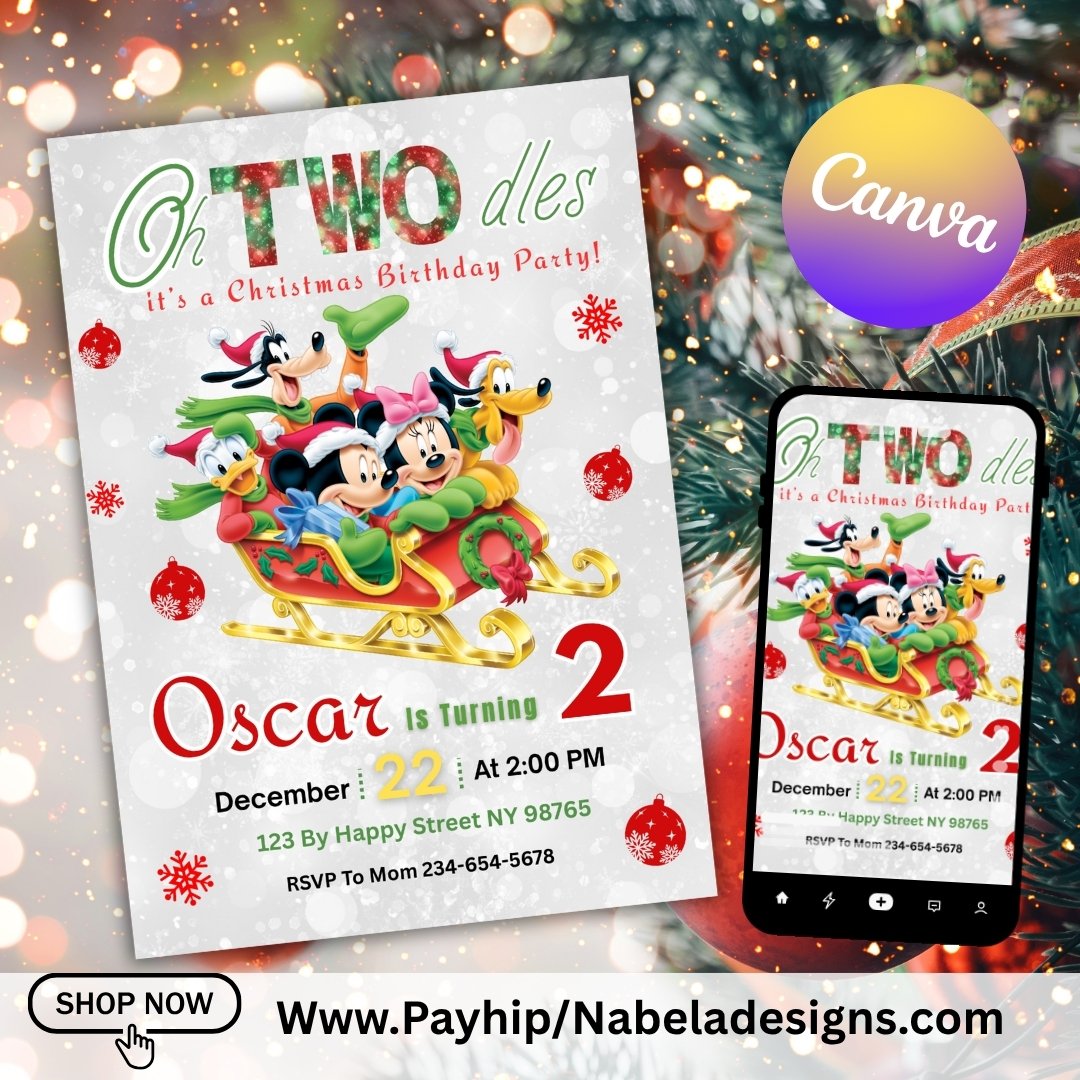 This festive editable Canva template features Mickey Mouse in a cute Christmas theme — perfect for a holiday birthday party full of fun and cheer. Customize your child’s name, age, date, and details in minutes.