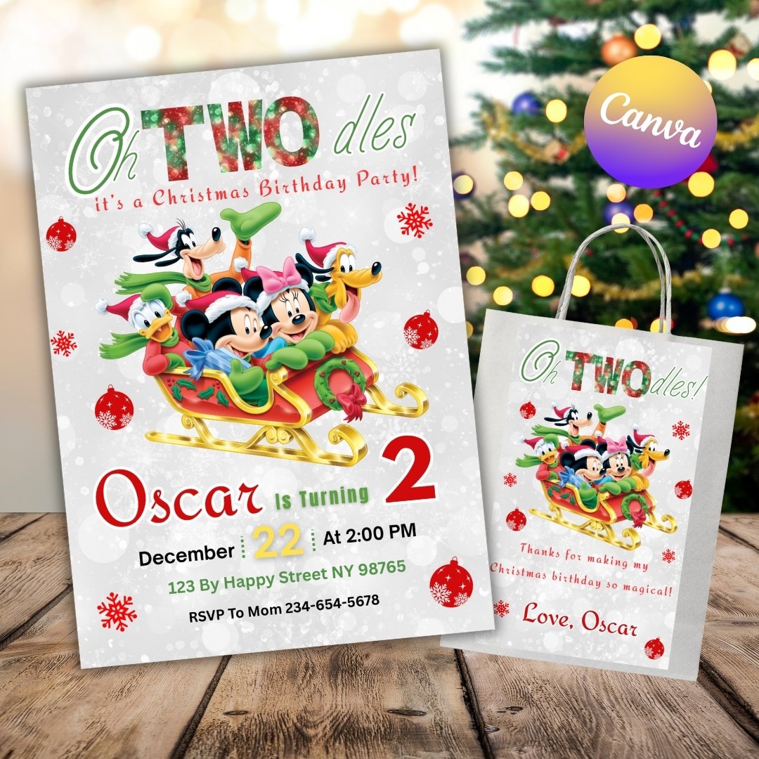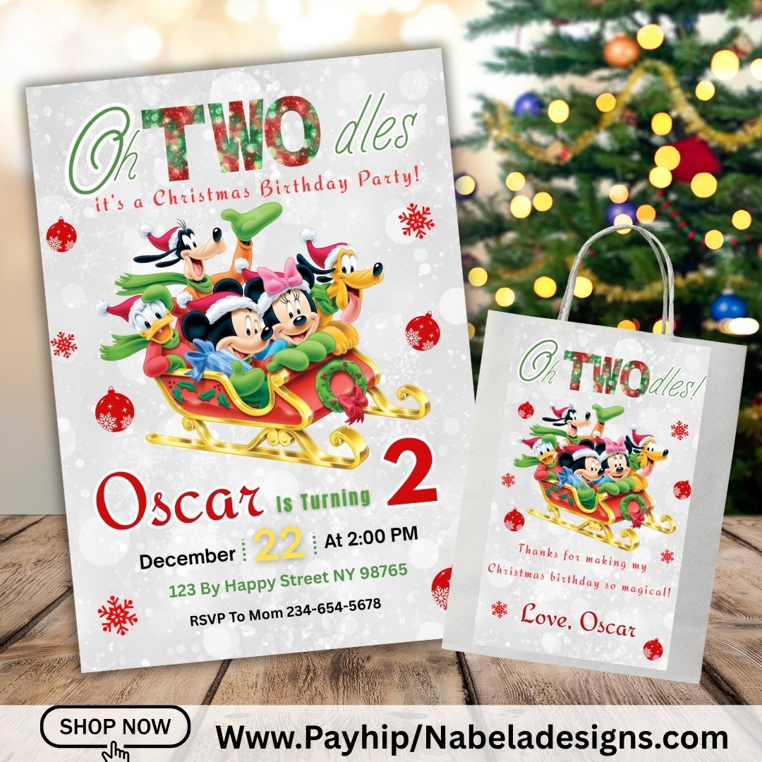 Make your child’s holiday celebration extra magical with this Mickey Mouse Christmas Birthday Invitation and Favor Bag Label set! 🎅