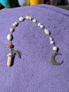 Hand beaded, stone and glass pendulum with moon charms. Inscription on moon reads I love you to the moon and back. Lovingly made, hand crafted, one of a kind piece.