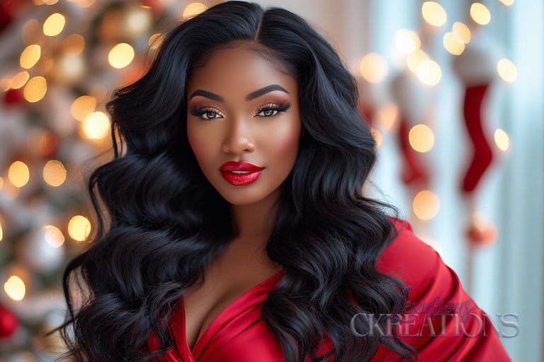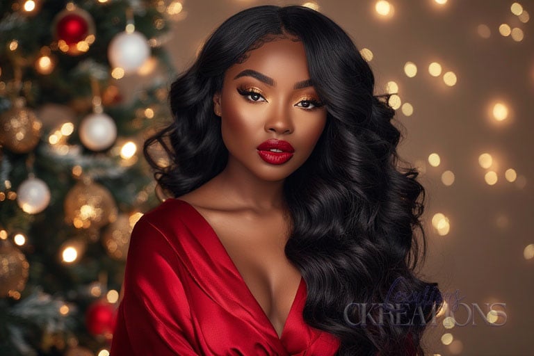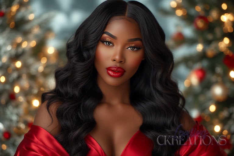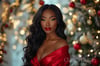 Celebrate the holidays in style with this realistic Gemini prompt featuring a glamorous African American woman modeled in a festive hair and beauty ad aesthetic. With voluminous, glossy black waves, flawless makeup, and a silky crimson gown, this prompt radiates elegance and sensuality.