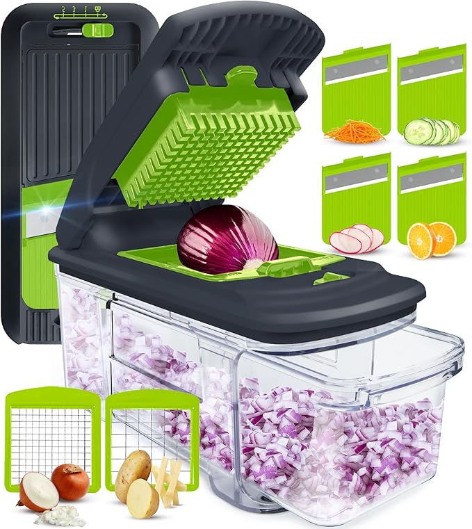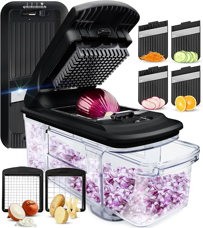 - Enjoy a mess-free kitchen experience with our catch tray, which makes cleanup effortless. The non-slip base enhances stability during slicing, chopping, and grating. Plus, the slicer chopper is entirely dishwasher-safe (top rack).
