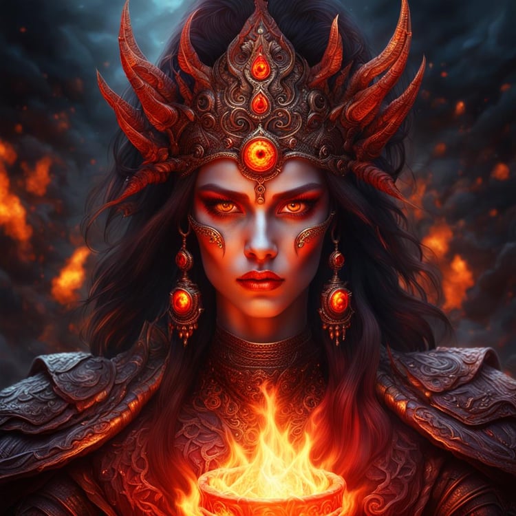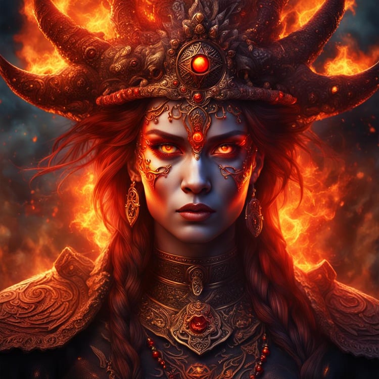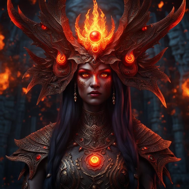 Unleash the fiery power of the "Majestic Fire Sorceress Queen," a photorealistic digital portrait that captures the intense gaze and commanding presence of a sorceress queen within the blazing confines of an Inferno Temple. This stunning artwork showcases the fire sorceress queen with glowing red eyes, exuding an aura of majesty and raw power.