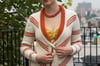 The Delancey Cardigan has a vintage feel with its striking chevron stripe motif and elegant shawl collar. Sections of thin diagonal stripes accentuate the sweater’s unusual zig-zag construction. Slanting stripes, in combination with the long sleek fit, make this a flattering design.