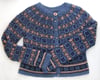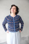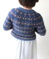 This is a pattern for a cardigan worked from the top down and in the round, with a circular yoke, and using the Fair-Isle colourwork technique.