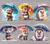 Cute animals in the rain with their umbrellas x 6; teddybear, mouse, hedgehog, fox. 6 PNGs, sublimation or print. Instant download