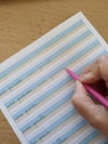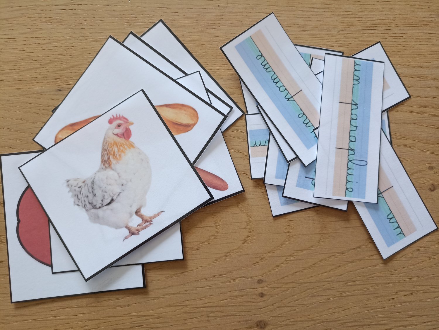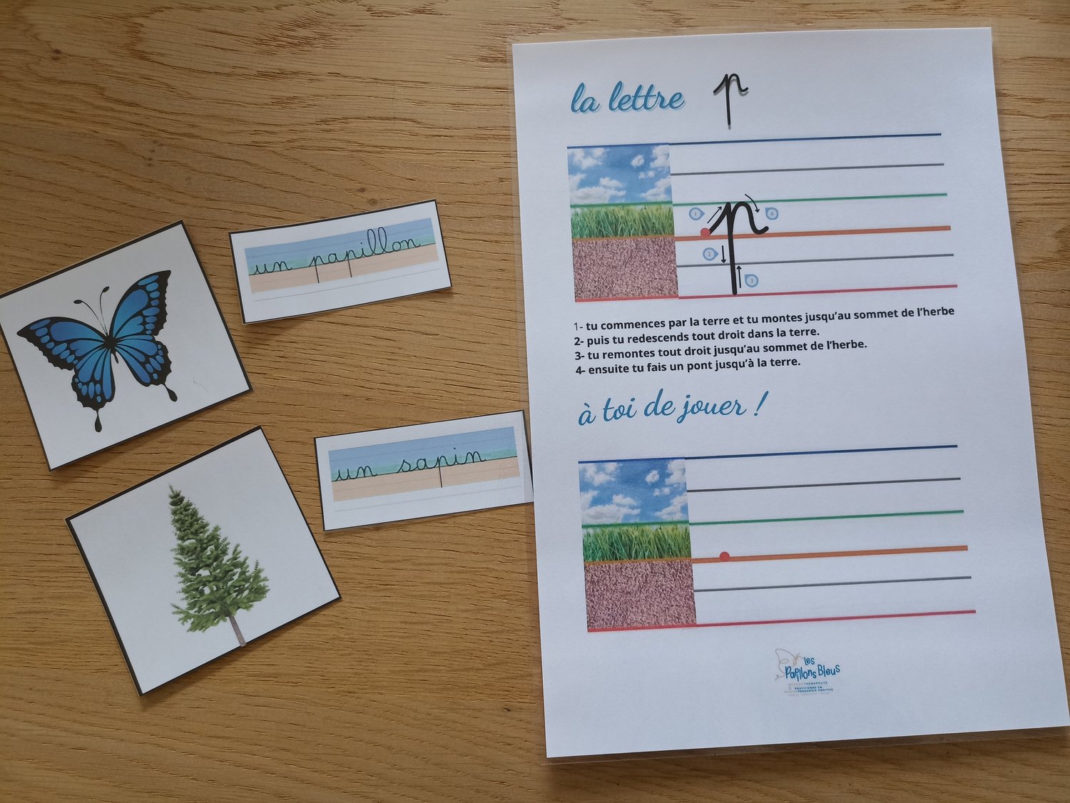 - lettre p : une fiche explicative, des cartes de nomenclature avec image et mot écrit en cursif, deux fiches d'entrainement (une pour droitier et une pour gaucher)