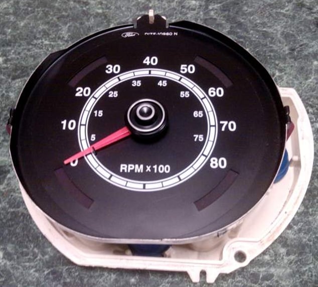 It is made from the warning light cluster itself and retains the four warning lights with the original text (hidden until activated), but adds a Mach 1 style tachometer with modern movement. The tach is designed to match the speedometer and look like a factory tach.