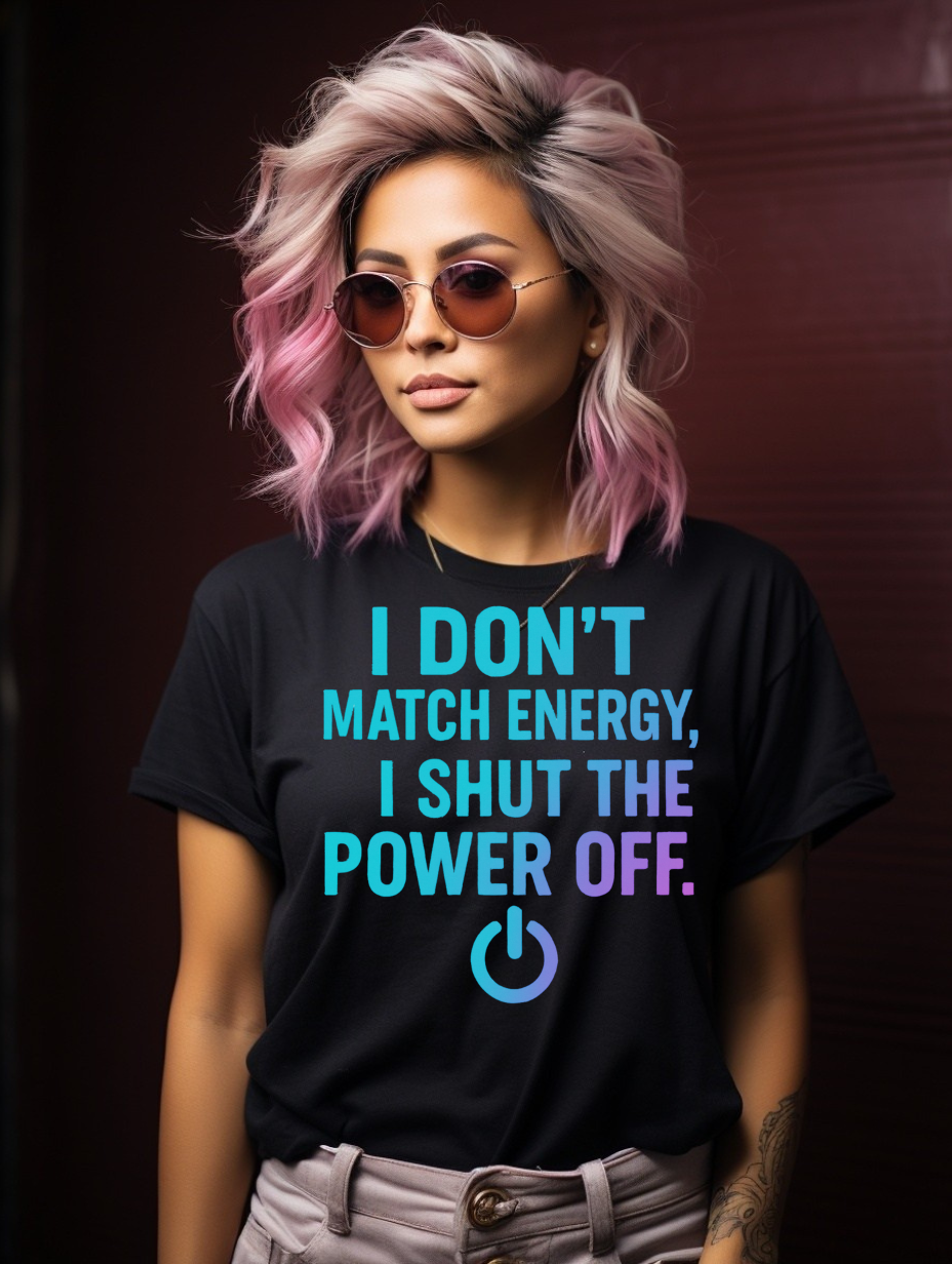 Make a bold statement with this sassy digital design that says it all: βI donβt match energy, I shut the power off.β Perfect for shirts, tumblers, totes, and more! Use it to express your vibe with a gradient blue-to-purple pop that turns heads.