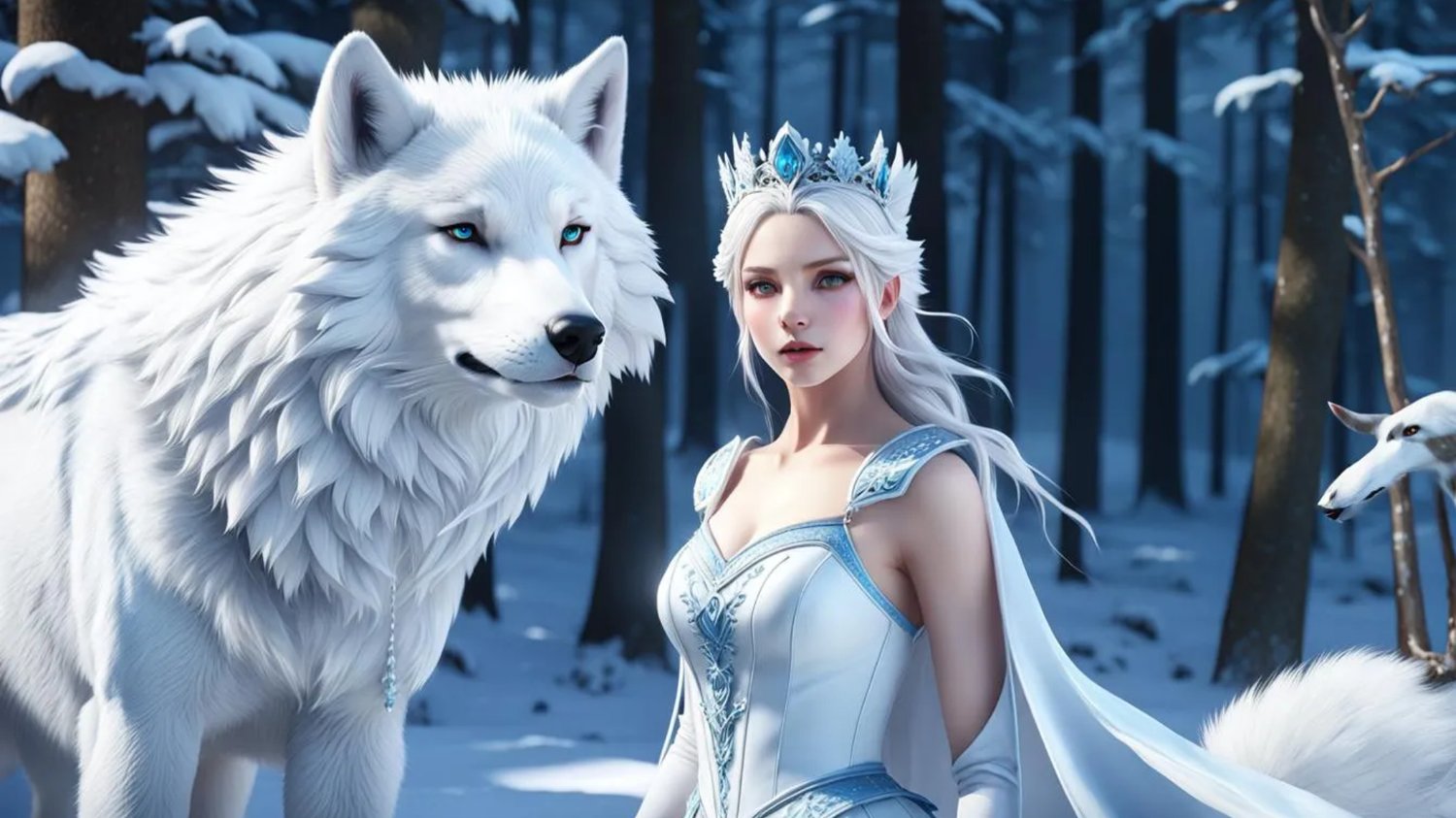 White Snow Queen with Giant White Wolf 3D Anime Art Digital Download