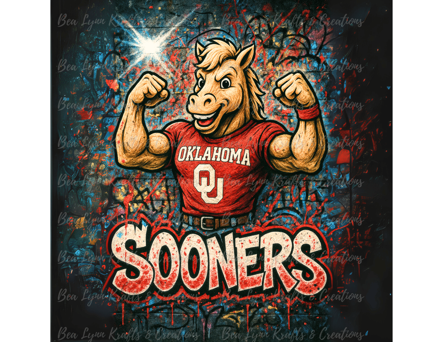 Unleash full-throttle fan energy with this bold, graffiti-drenched Oklahoma Sooners mascot PNG! Featuring a jacked-up horse mascot flexing in front of an explosive wall of street-style spray paint, this transparent image is the ultimate fusion of team pride and urban swagger. The gritty, colorful backdrop combined with the iconic crimson Oklahoma shirt and fierce “SOONERS” lettering makes this design perfect for turning heads on game day.