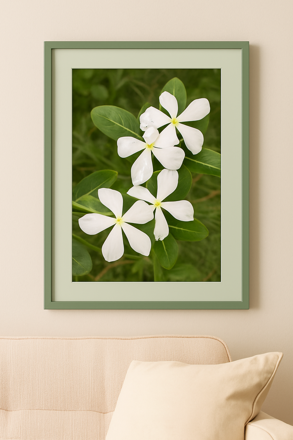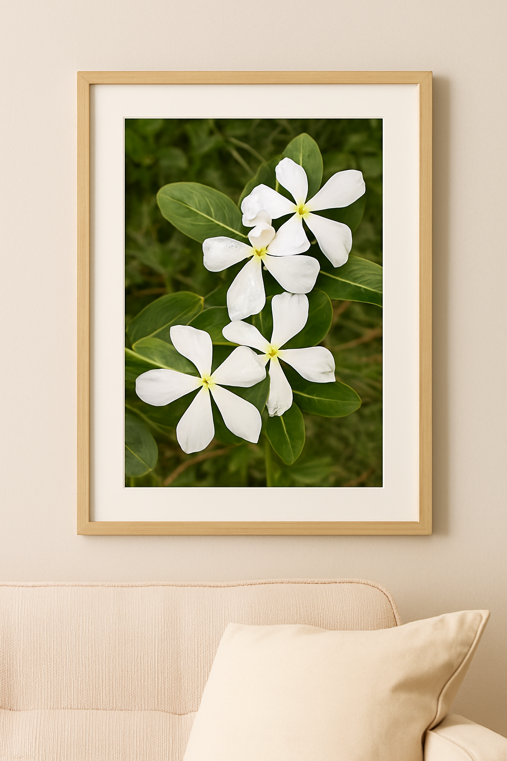 Bring natural elegance into your space with this framed botanical art print featuring the delicate white Madagascar periwinkle. This high-quality digital artwork captures the gentle beauty of three blossoms, ideal for modern, minimalist, or nature-inspired interiors. Whether displayed on its own or as part of a gallery wall, this piece offers a calming and sophisticated floral touch.