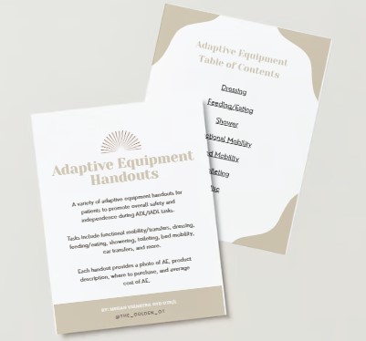 UPDATED to 53 pages of adaptive equipment PDF handouts for patients to promote overall safety and independence during ADL/IADL tasks.