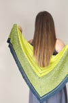 The shawl is knit down and out from the center of the top edge, with increases at the center and sides. It’s finished with a garter stitch border.