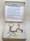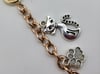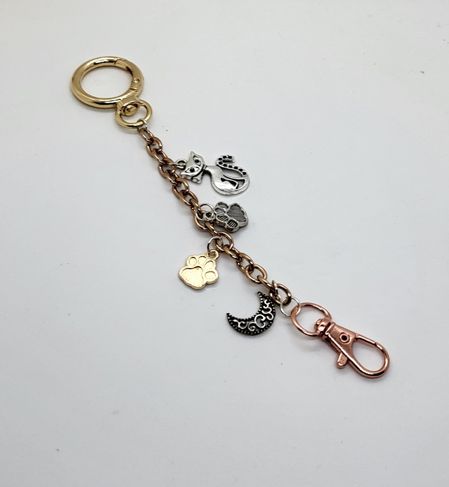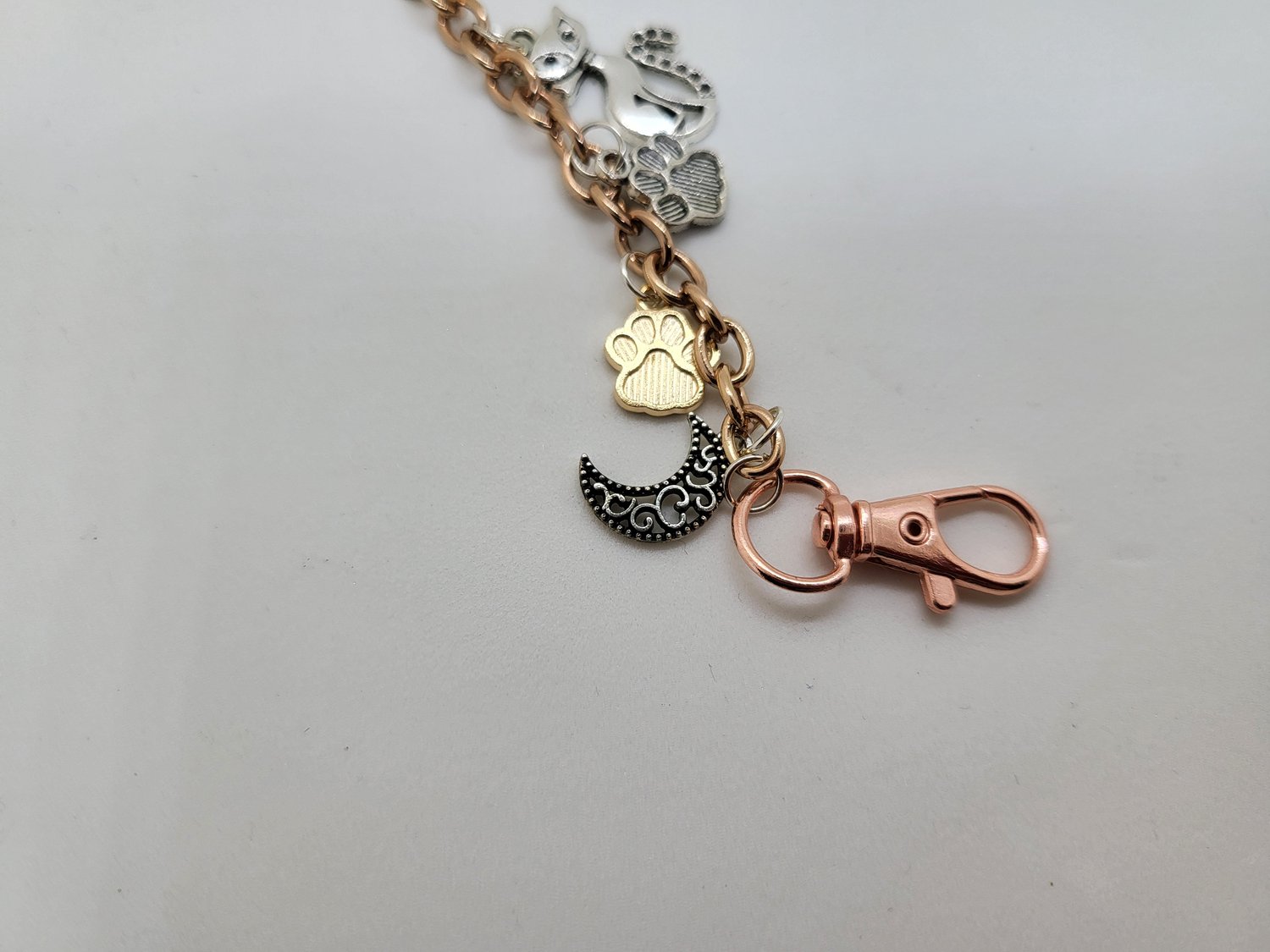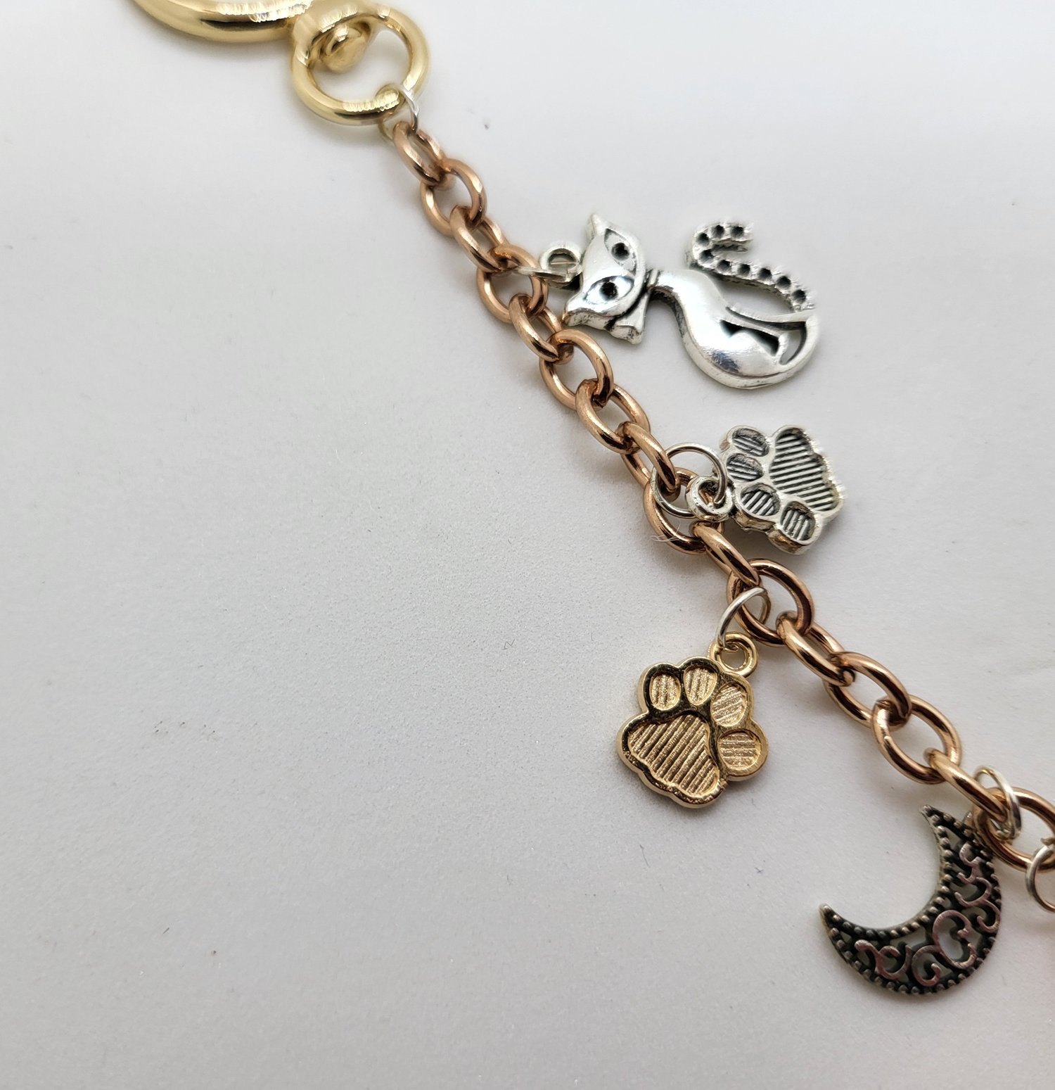 - Charms: Slender silver Siamese cat, silver crescent moon, gold and silver paw prints