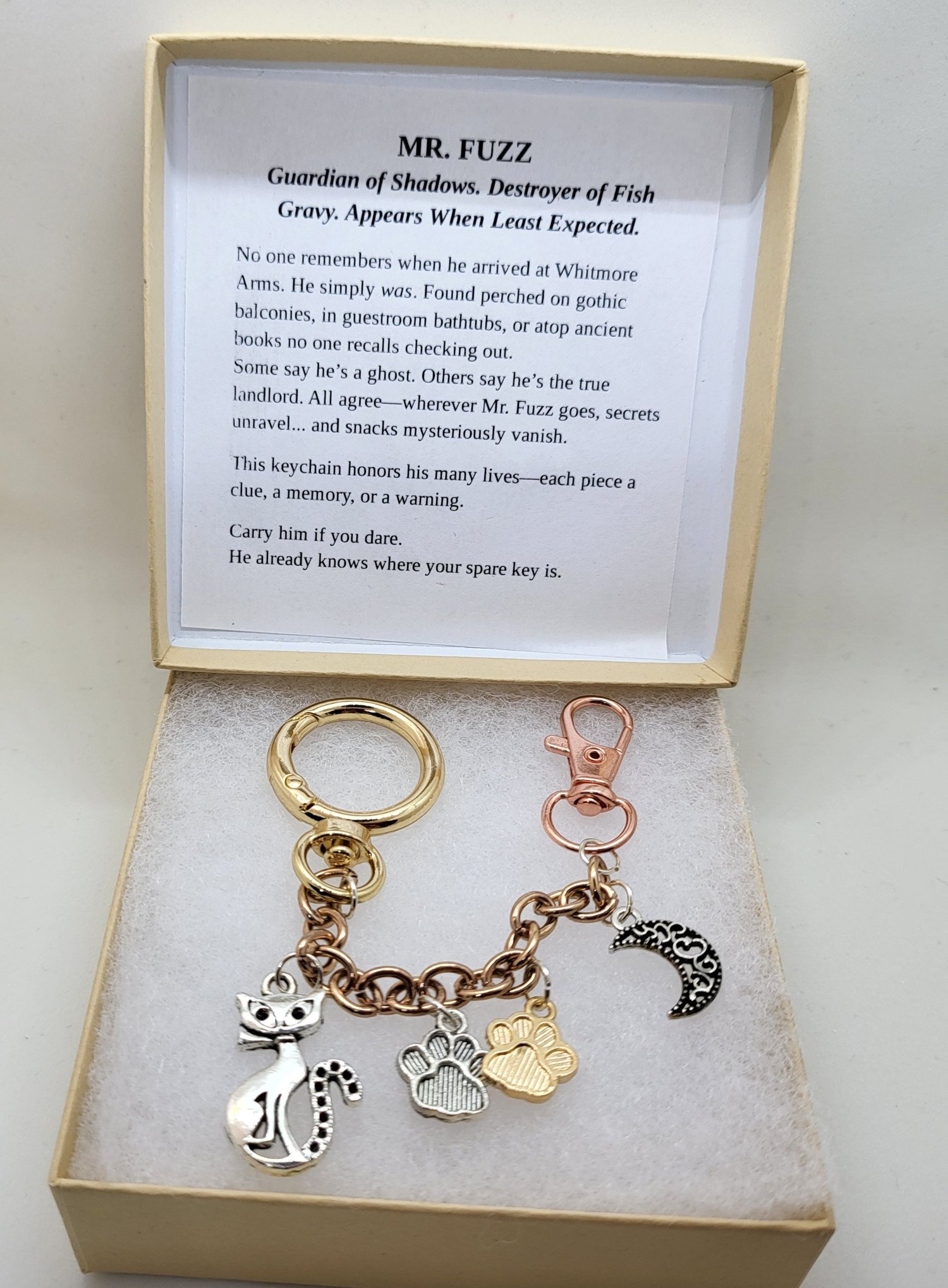 A 6-inch full-metal keychain tribute to Mr. Fuzz, the watchful Siamese cat of the Velvette Library universe. Features hand-assembled charms and a story card of his mysterious appearances.