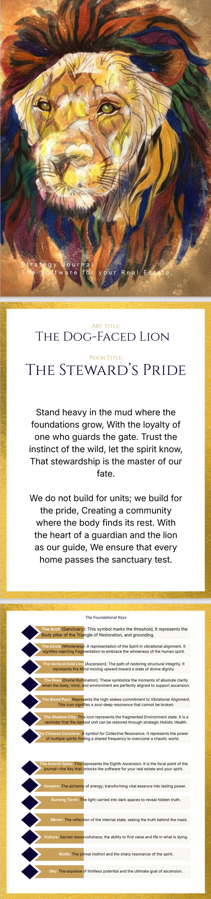 - The Spirit: Visual motifs Featuring the dogfaced lion to represent [Ascension/Protection/Illumination], it serves as the physical VIBRATIONAL foundation for your strategy sessions.