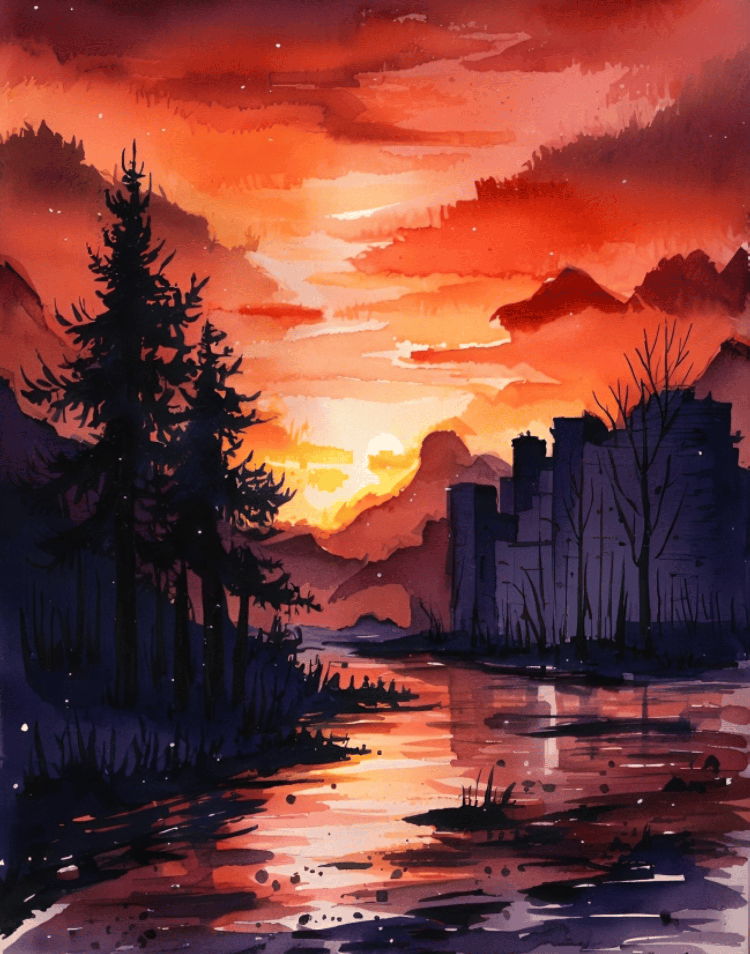 Vintage Landscape, Vintage Sunset, Modern Style , Dusk, Beautiful Sunset, Digital Art.