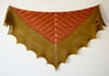 Finished dimensions of the sample shawl: Span width of 186 cm (73 ¼ inches) measured along the upper edge, and a depth of 89 cm (35 inches), measured after blocking.