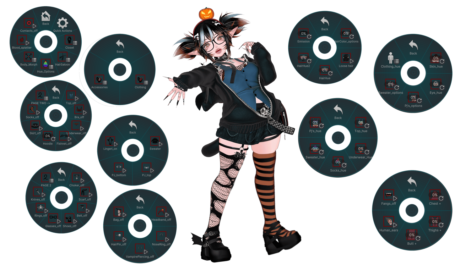 -> Shoes -> Glasses -> Belt -> Rings -> Headband -> Bag -> Nose ring -> Vamp Piercing -> Hairpin -> Choker -> Knives