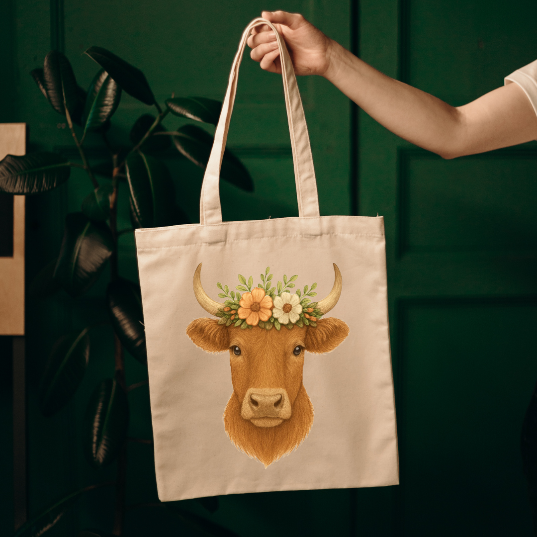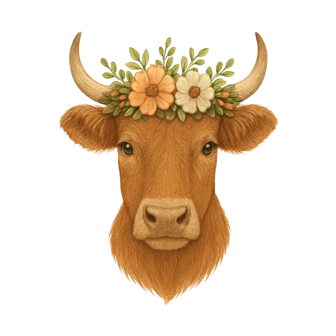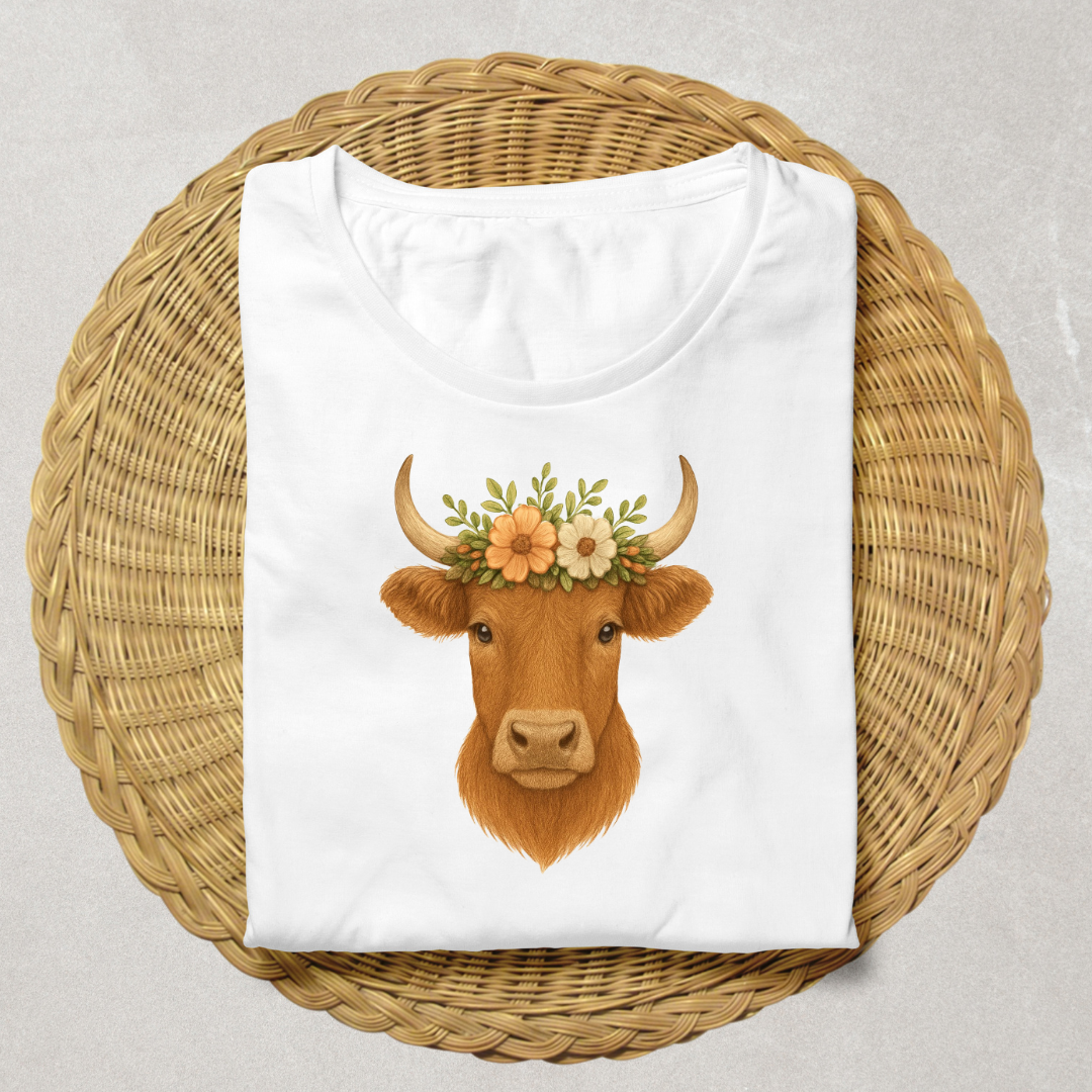 Highland Cow Embroidery Design โ Floral Crown Farmhouse Style ๐ฎ๐ธ
