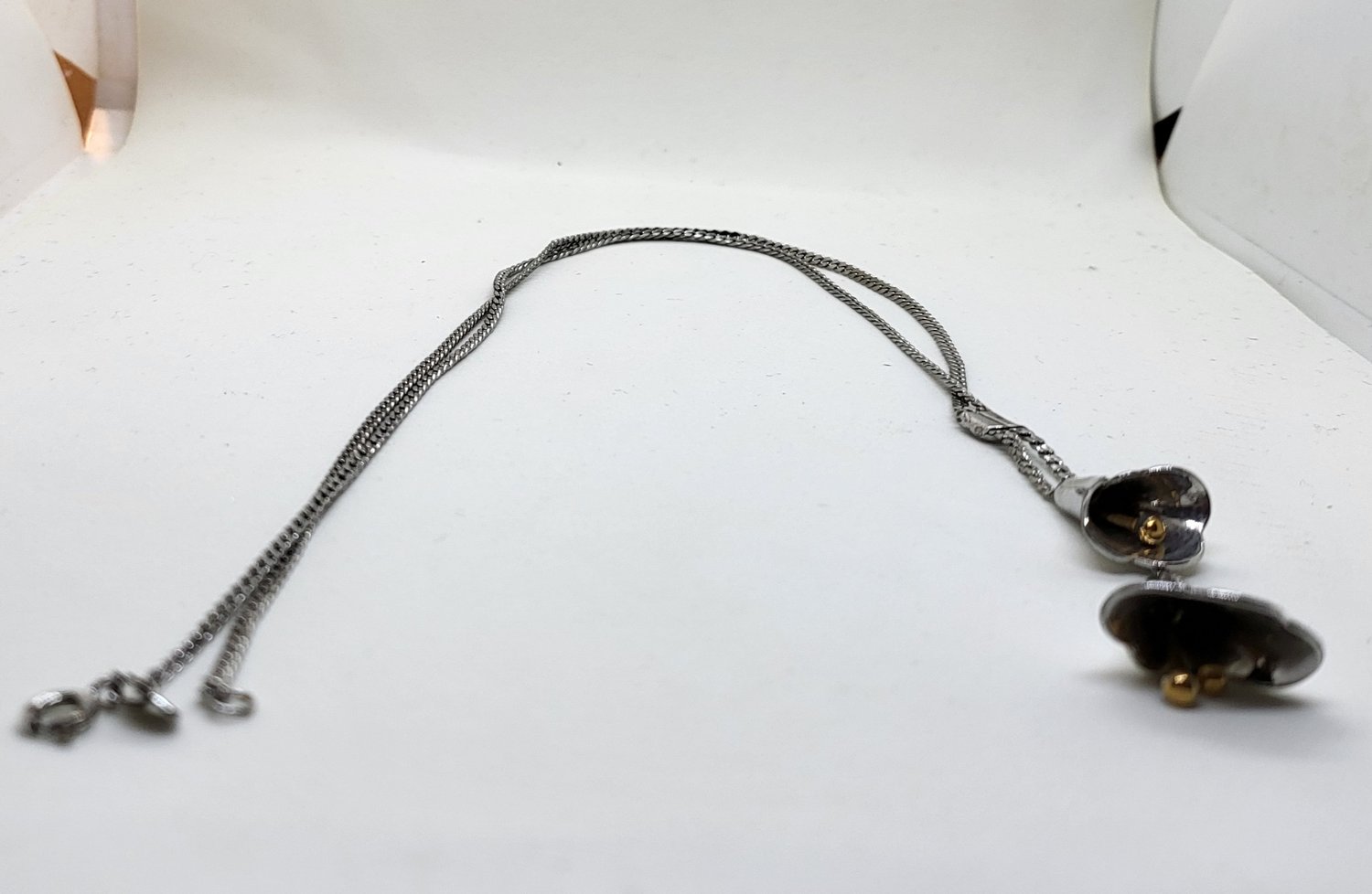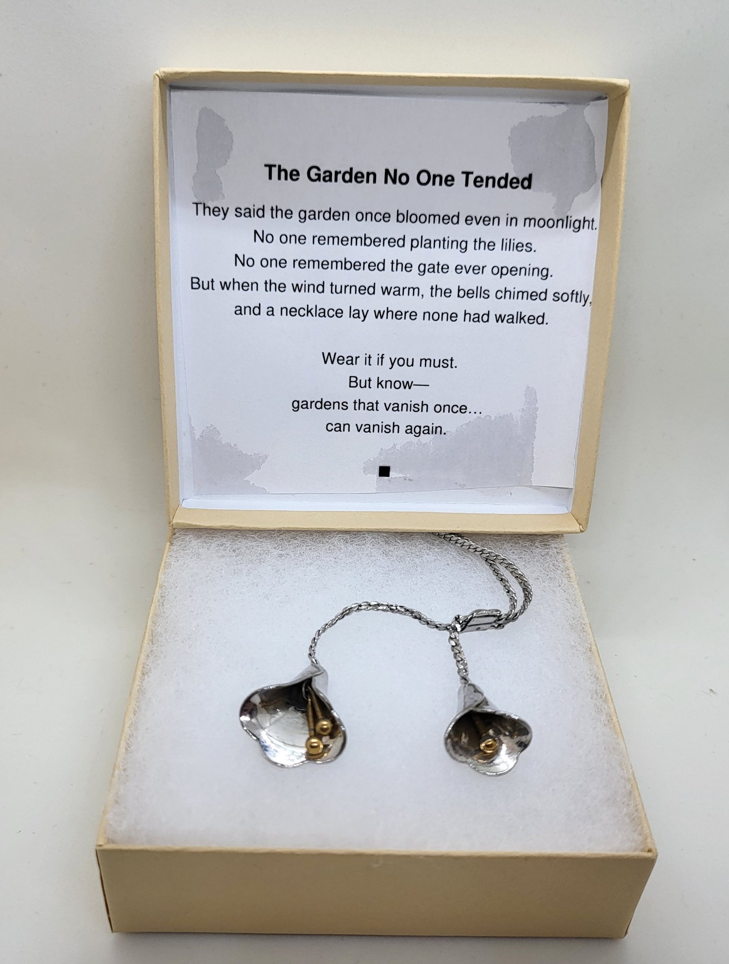 A wistful bloom from a forgotten spring. Twin calla lilies in gold and silver dangle from a 23" lariat, evoking dusk-lit gardens and locked glass conservatories. Mint condition, never worn.