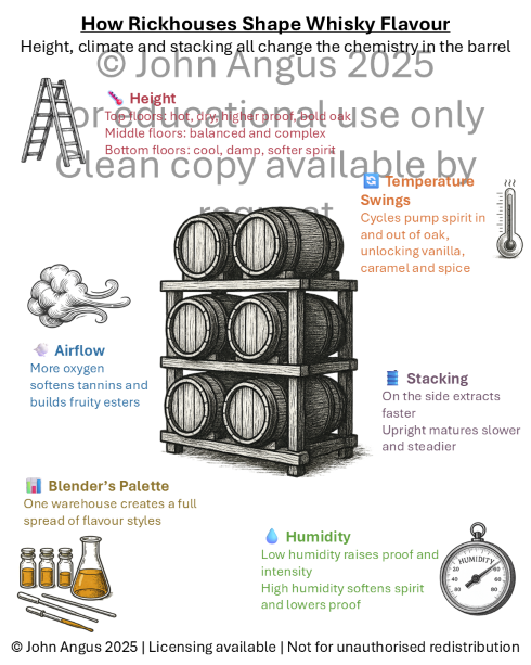 A clear, hand drawn style makes it ideal for training, education or presentations. Perfect for explaining how rickhouses give distillers and blenders their flavour toolkit.