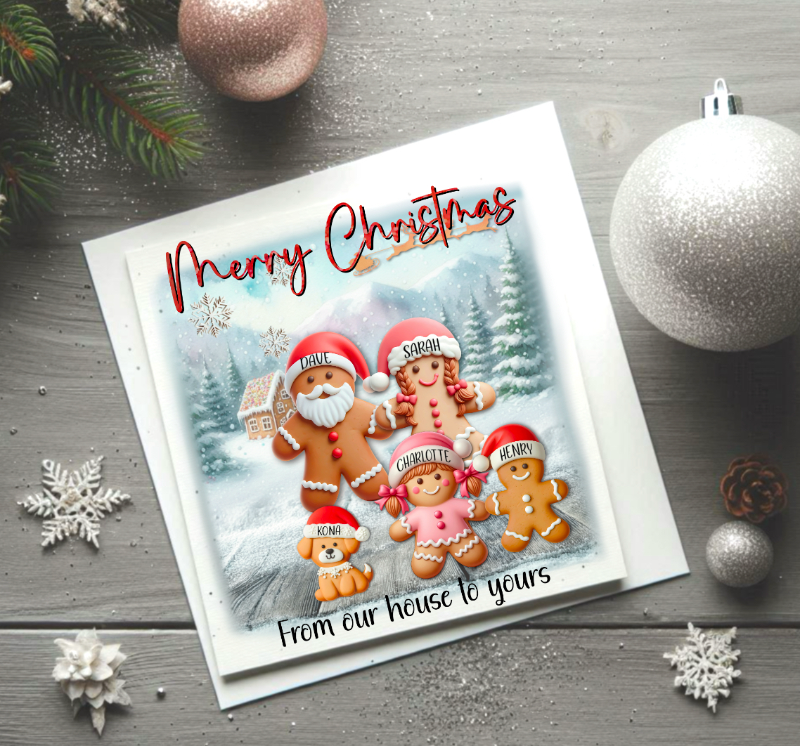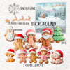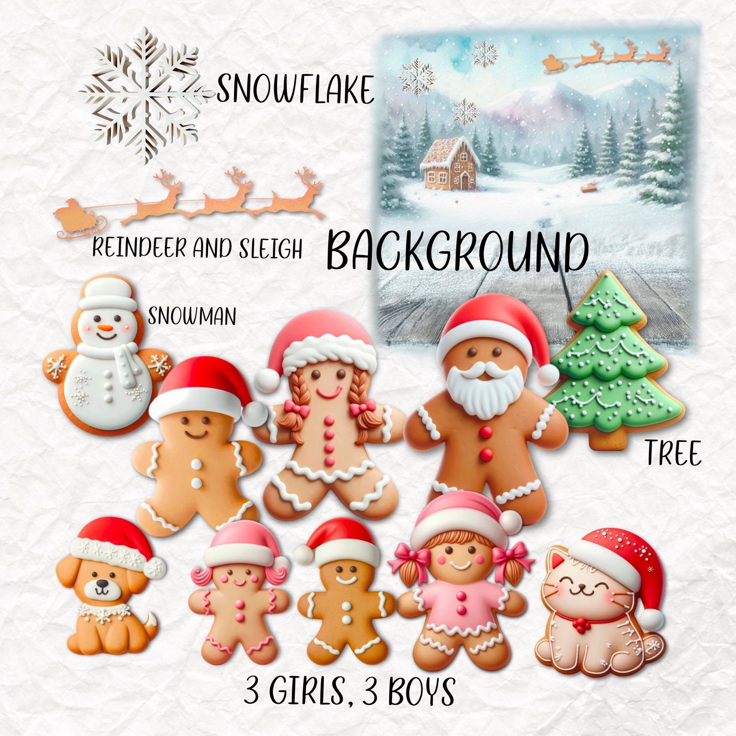 Christmas gingerbread cookie family clipart, Sublimation, print, DTF etc. 11 PNGs; background, 3 girls/boys, dog, cat, Santa, tree, snowman. 11 Individual transparent files for your personalised projects.
