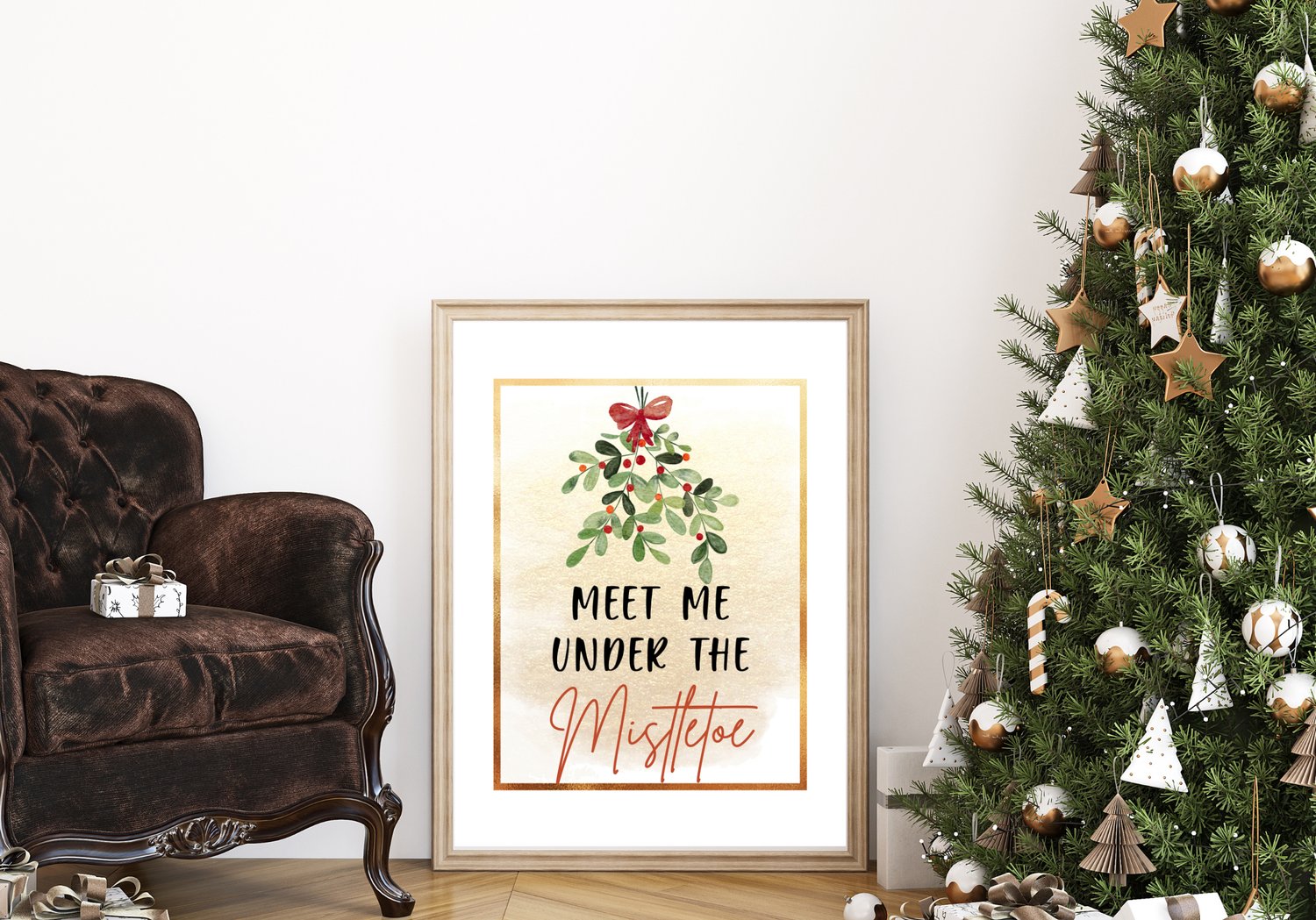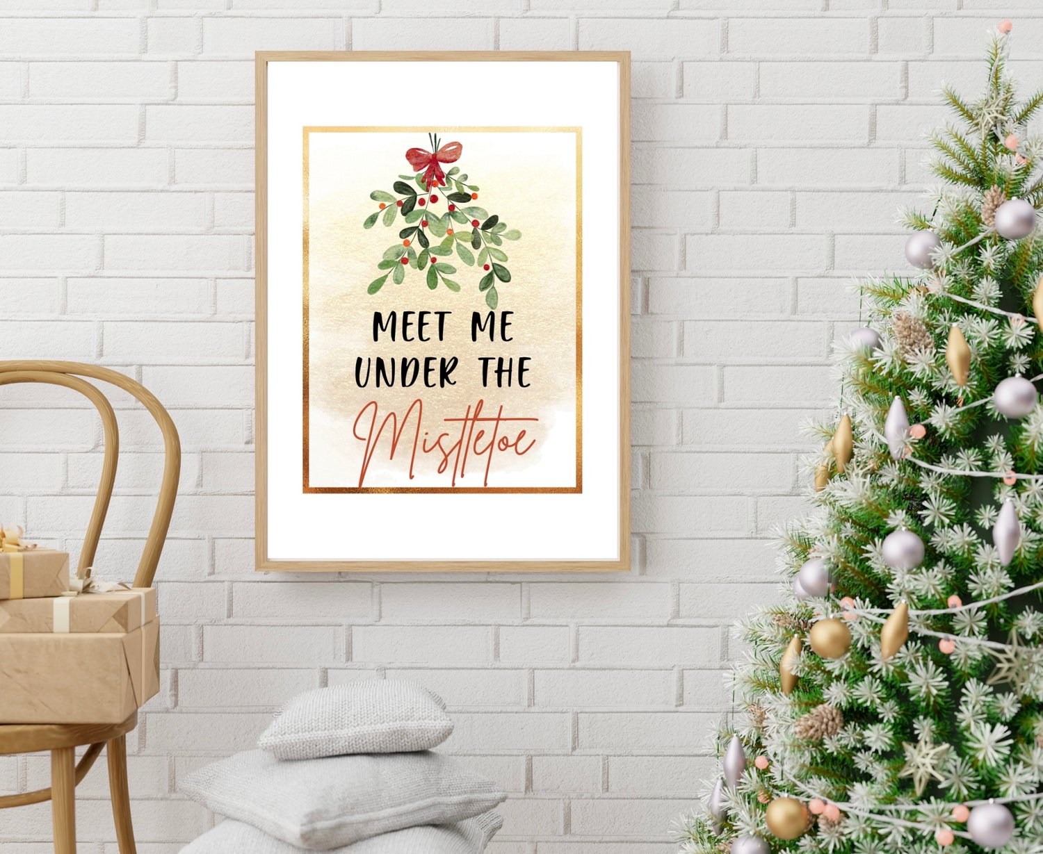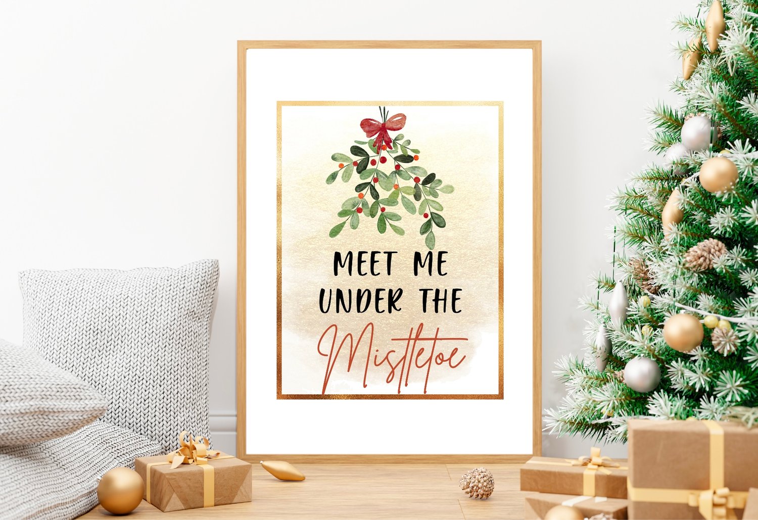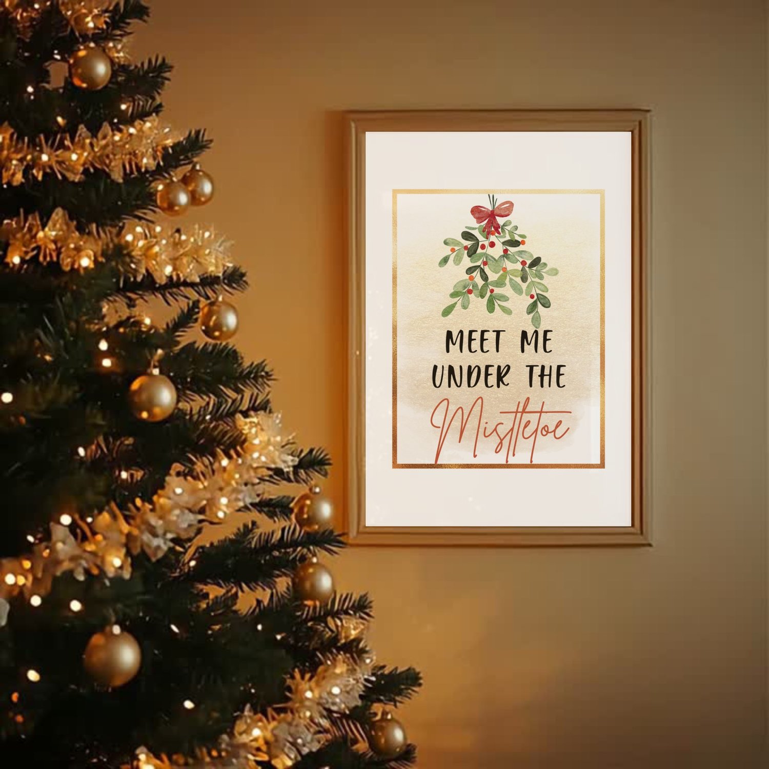Add a touch of holiday romance to your home with this “Meet Me Under the Mistletoe” wall art printable. Featuring a watercolor mistletoe with a red bow, soft gold background, and elegant festive lettering — it’s perfect for your Christmas decor, entryway, bedroom, or seasonal gallery wall.