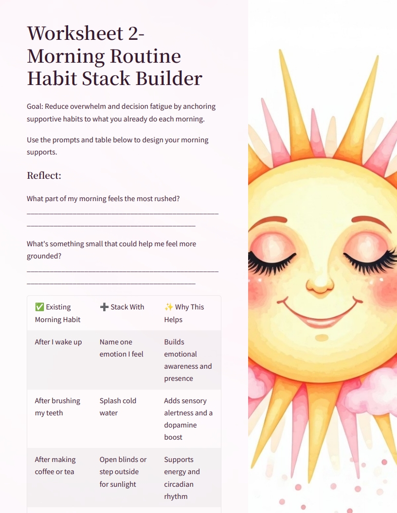 - 6 ADHD-friendly worksheets - 19 pages to build simple, sensory-friendly habit stacks
