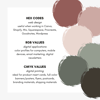 + Detailed Hex Codes, RGB, and CMYK values for each color