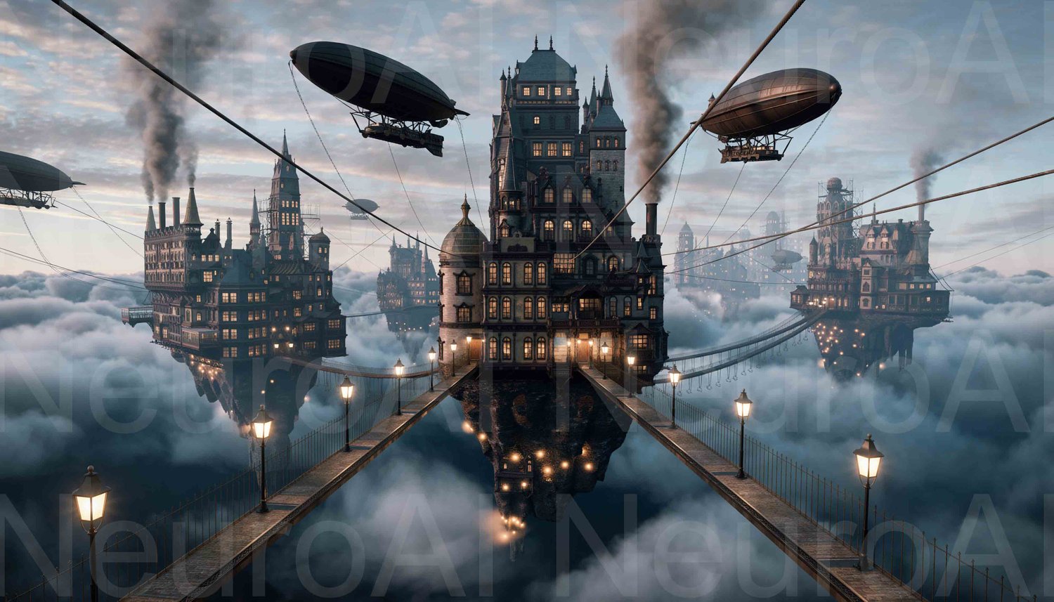 Steampunk cityscape floating above the clouds dream