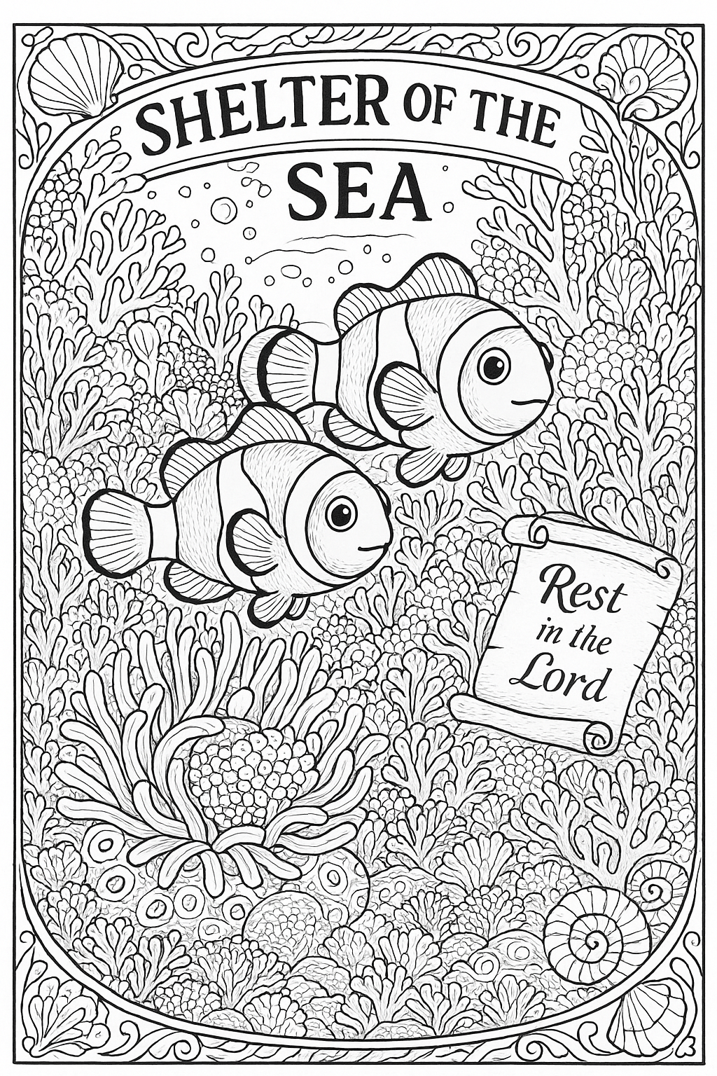 Find peace beneath the waves with this Clownfish Scripture Coloring Page, featuring two beautifully detailed clownfish swimming through coral and sea plants, framed by seashells and gentle ocean lines. Paired with the affirmation βRest in the Lord,β this printable invites calm, reflection, and creative worship β perfect for devotional kits, homeschool activities, or ministry gifts.