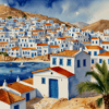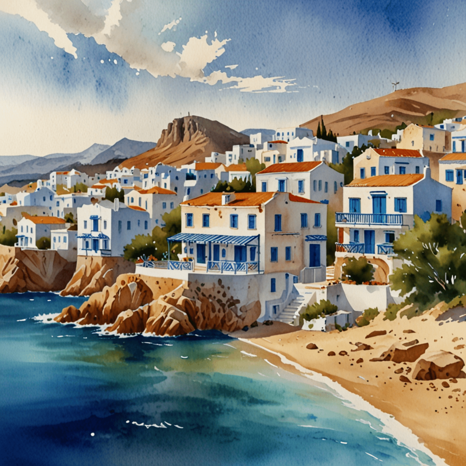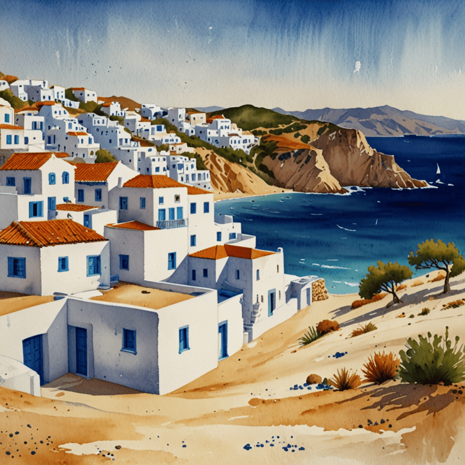 Summer on a Greek island. Sea. Sand beach. White houses. Blue roofs. The beauty of the place. Watercolor.