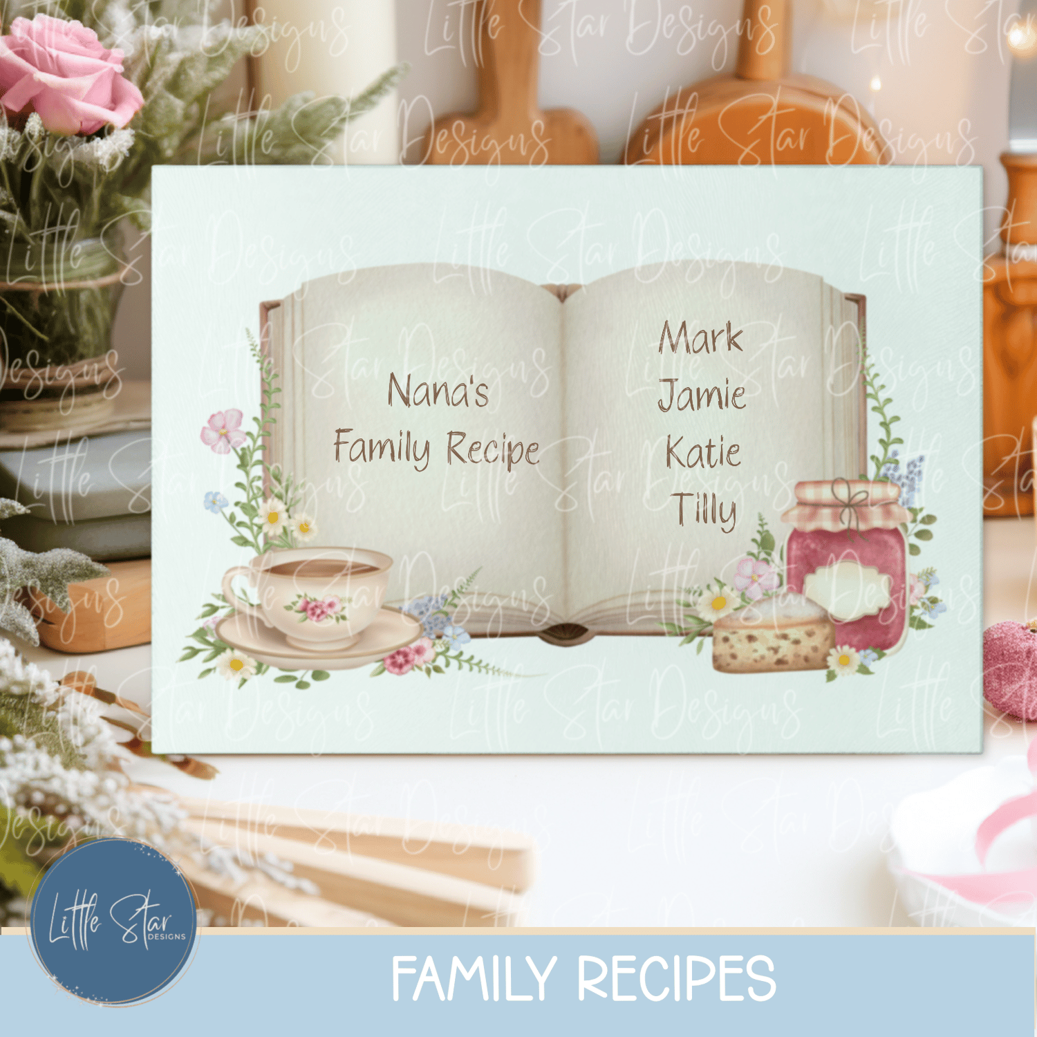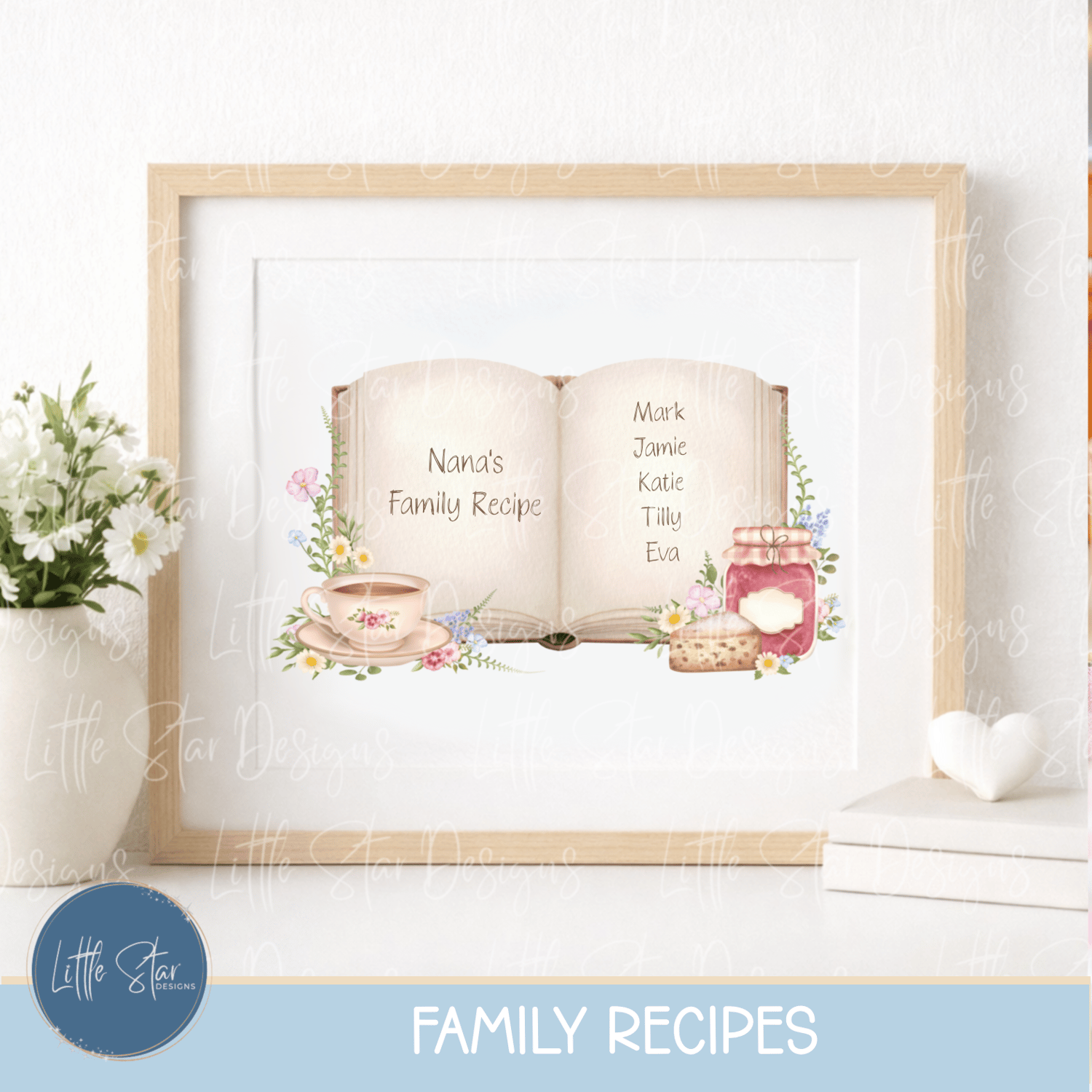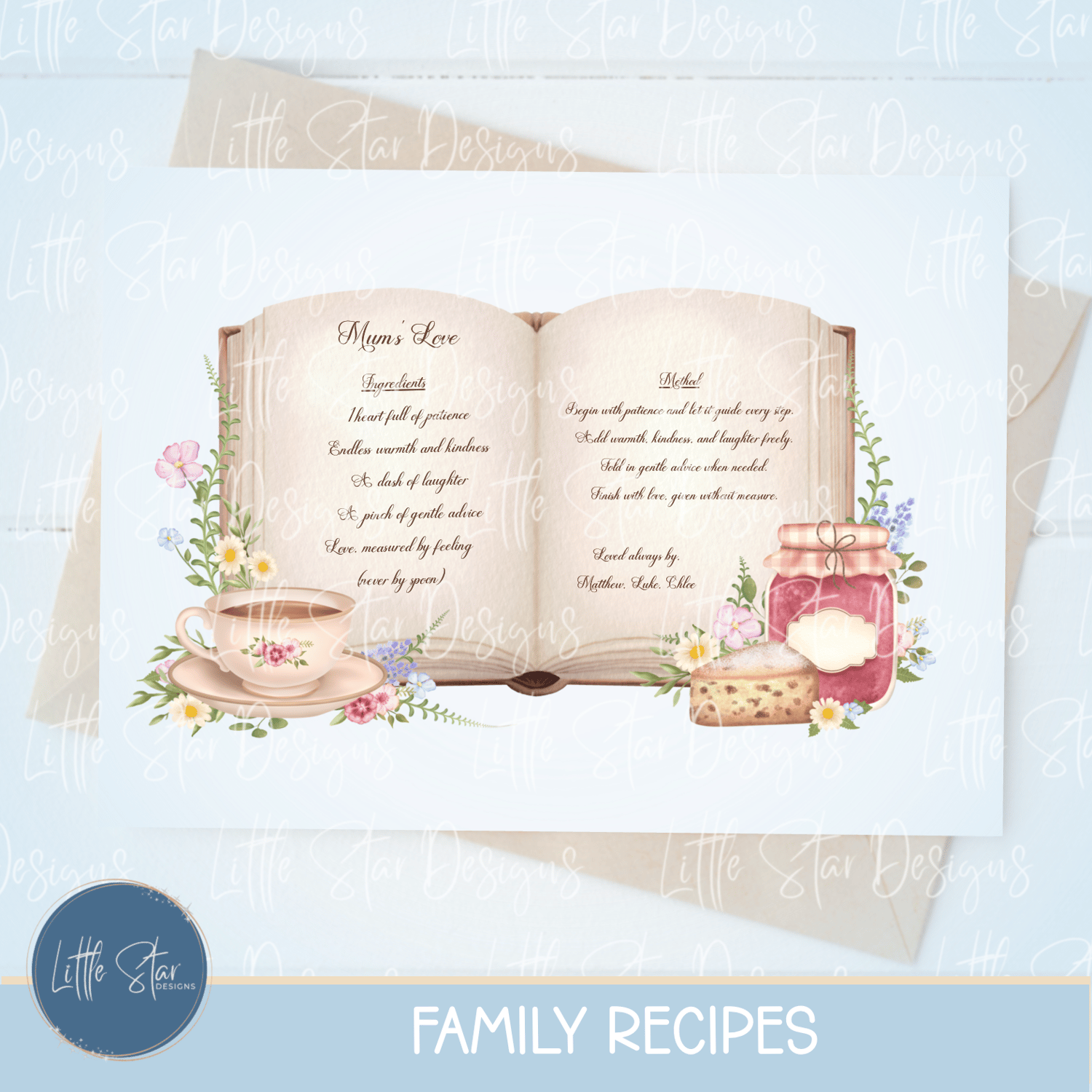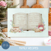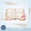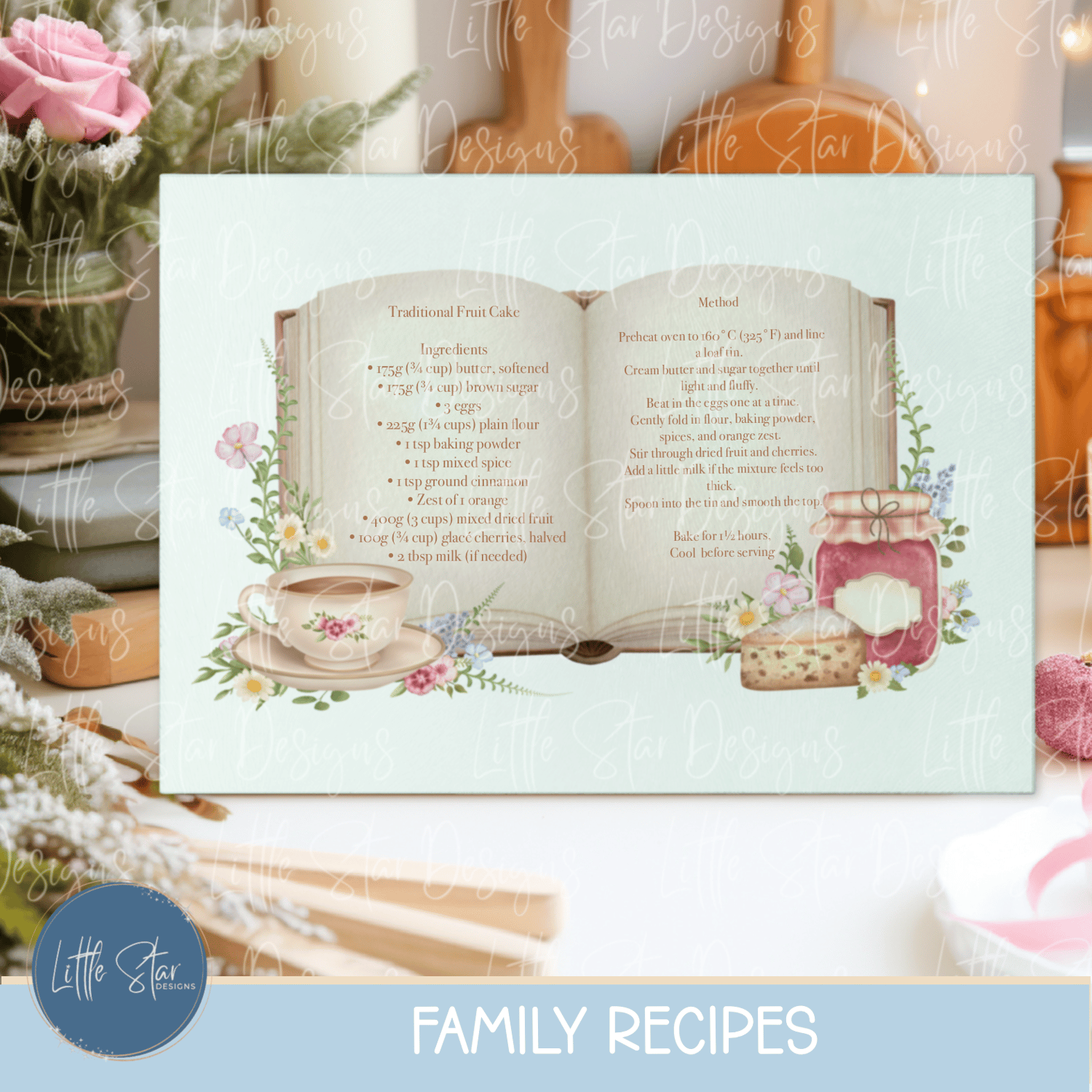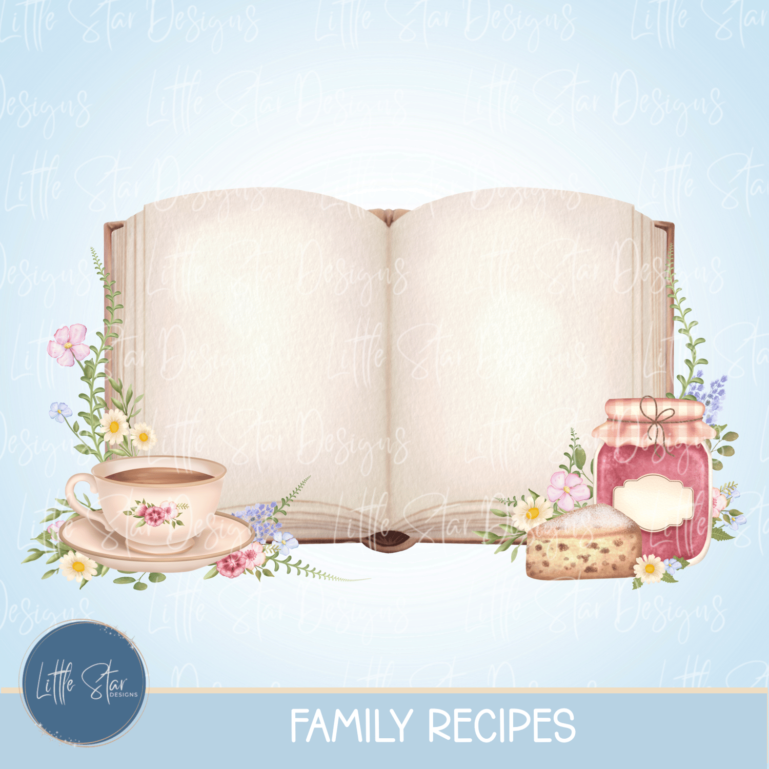 ⭐️ 1 png depicting an open recipe book, with floral details, jam, cake & teacup